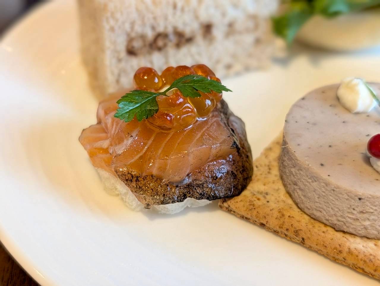「竹炭塩でマリネしたサステナブルサーモン」は、オレンジ色が美しく輝きます。