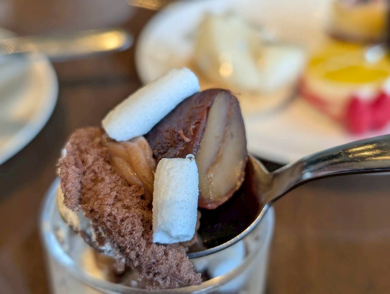 グラスの中で織りなす、栗の濃厚な甘みとスポンジのやさしい口当たりが、溶け合うように一体感を生み出します。