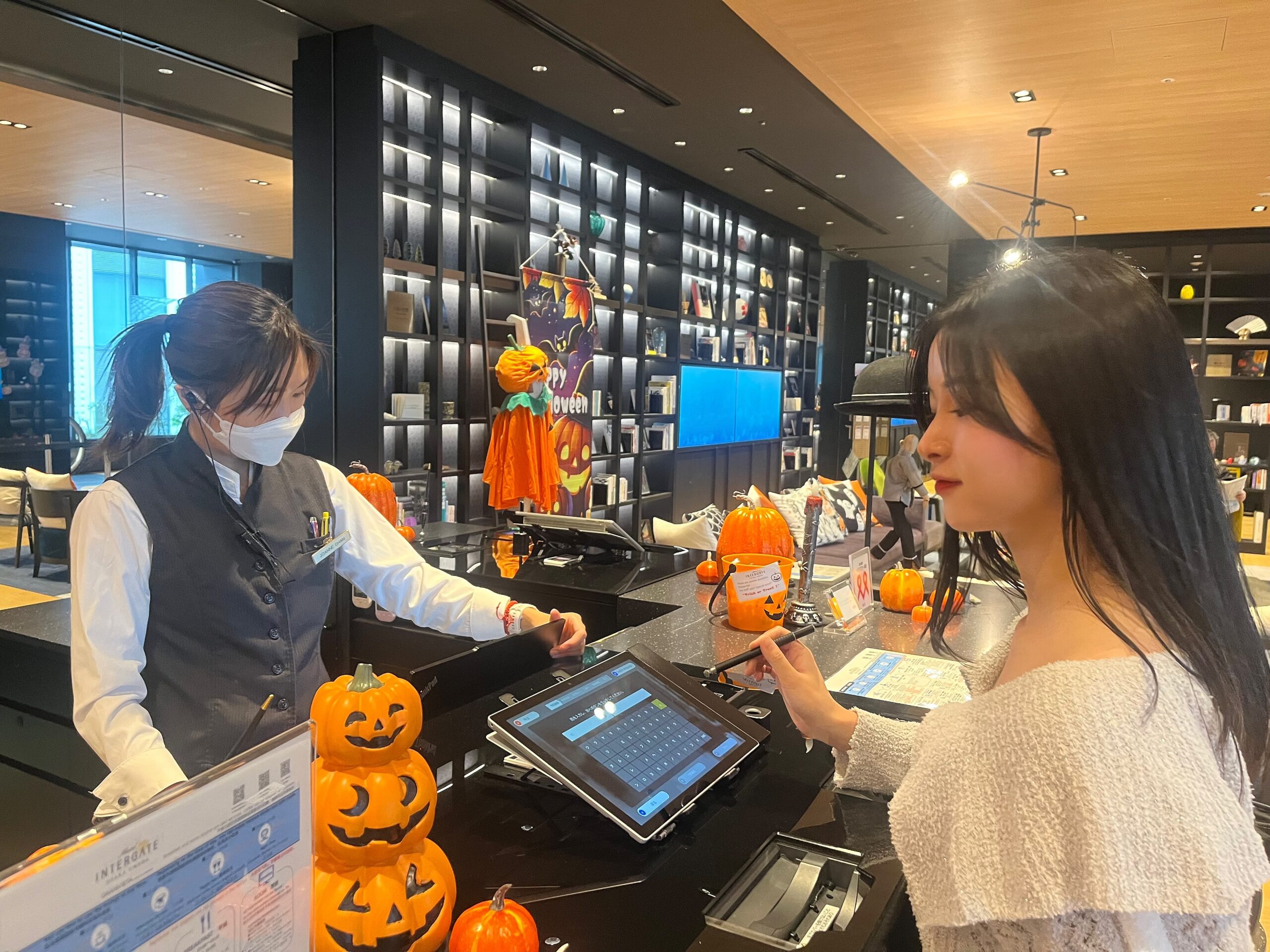 フロントにて予約内容を確認し、館内設備について説明を受けました。