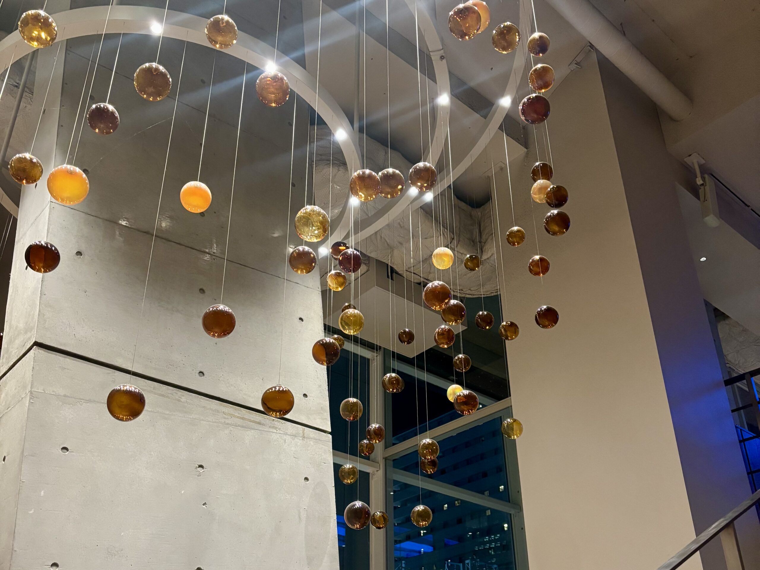 ブルーボトルのコーヒーをイメージしたブラウンの球体ガラスが幻想的に、そして昼間は自然光と照明の光を取り込んできらめき、吹き抜けをあたたかく照らします。