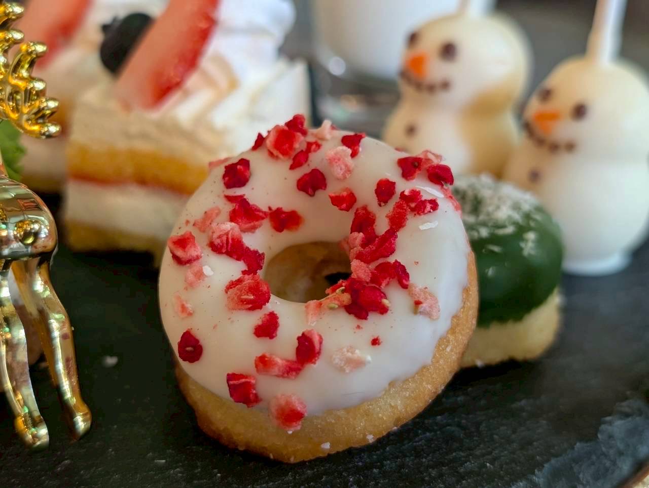 雪のように白いホワイトチョコがコーティングされた「クリスマスドーナツ」。