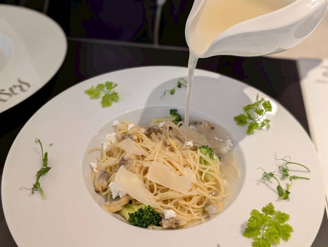魚介のスープをかけて味わう、2種のチーズを使用したボンゴレビアンコ。