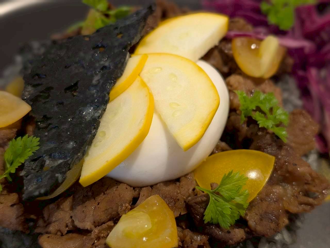 ブラックペッパーを効かせた牛肉と卵、彩り野菜をトッピングしたバター風味のフライドライス。