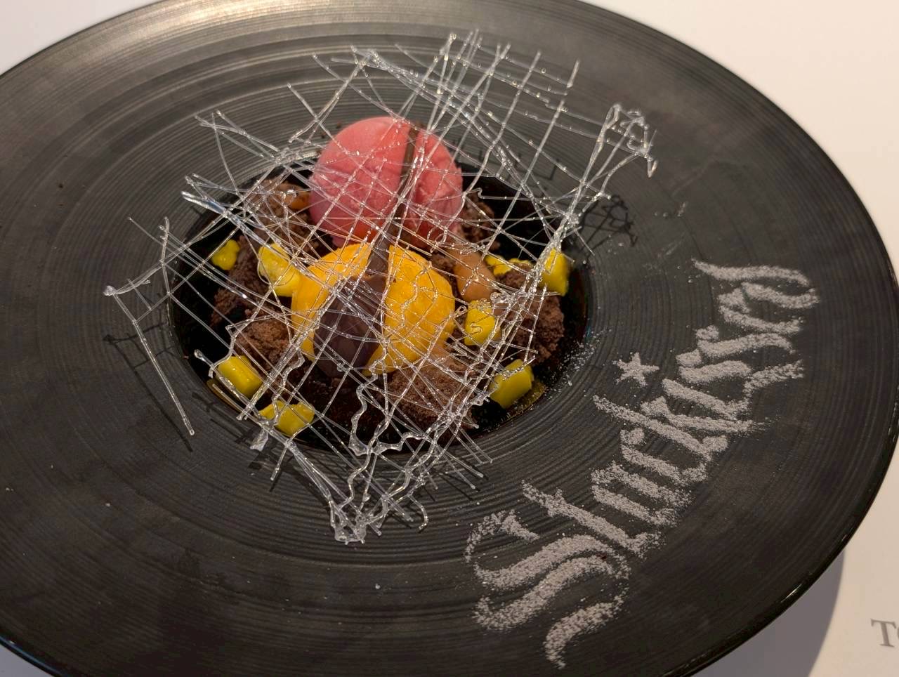 チョコブラウニーに、オレンジとフランボワーズのシャーベット、マンゴーを組み合わせたプレートパフェ。