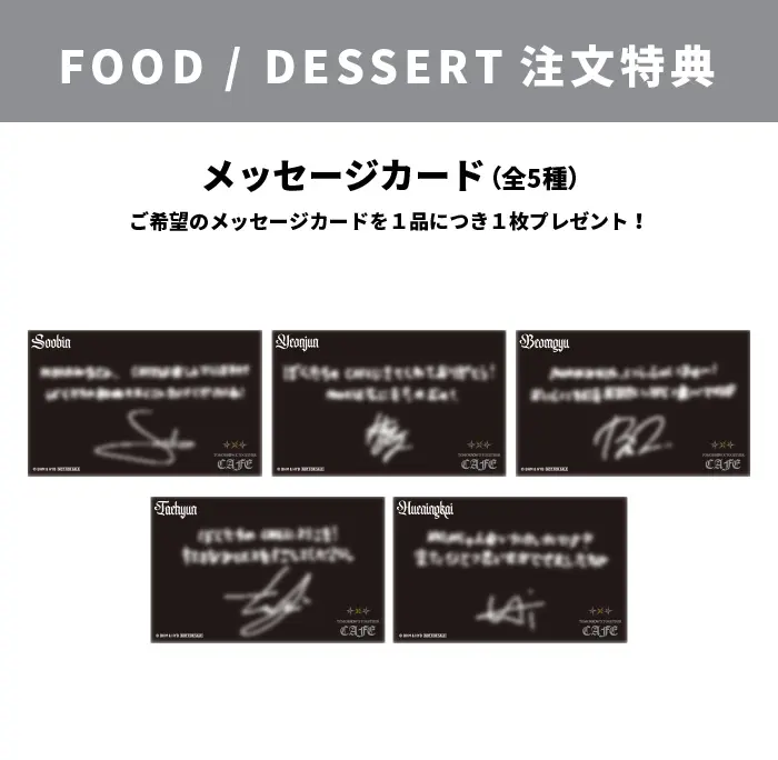 ご希望するメンバーの「メッセージカード(全5種)」を1品につき1枚プレゼント。