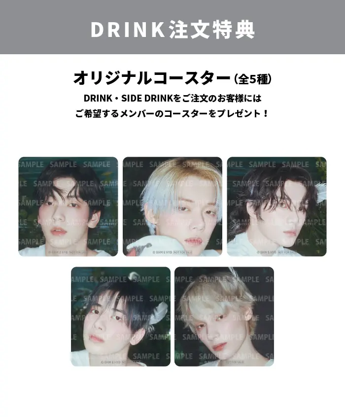 ご希望するメンバーの「オリジナルコースター(全5種)」を1品につき1枚プレゼント。