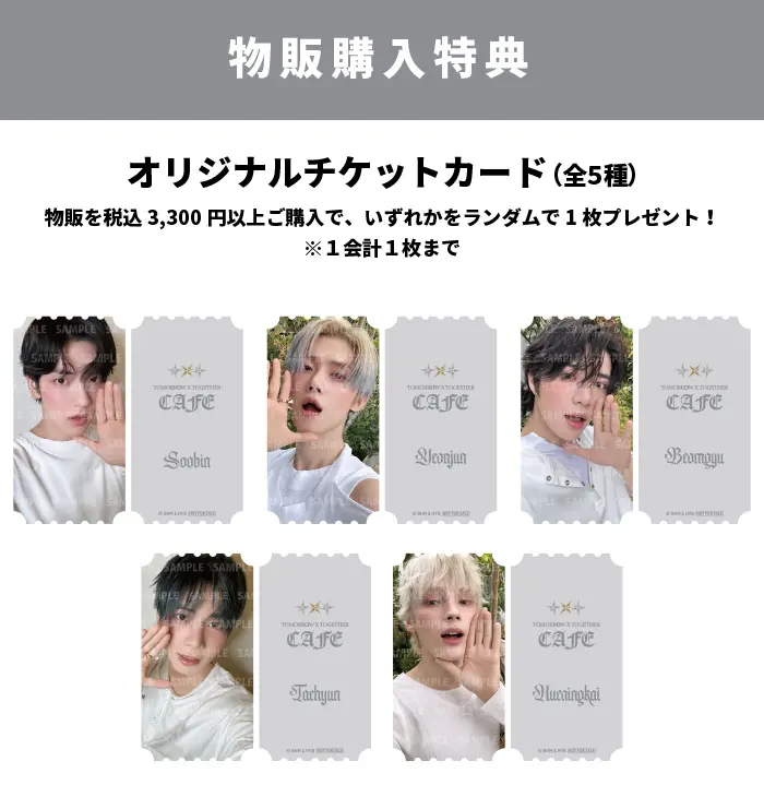 1回の物販会計でカフェオリジナルアイテムを税込3,300円以上ご購入いただいた方に「オリジナルチケットカード(ランダム5種)」を1枚プレゼント。