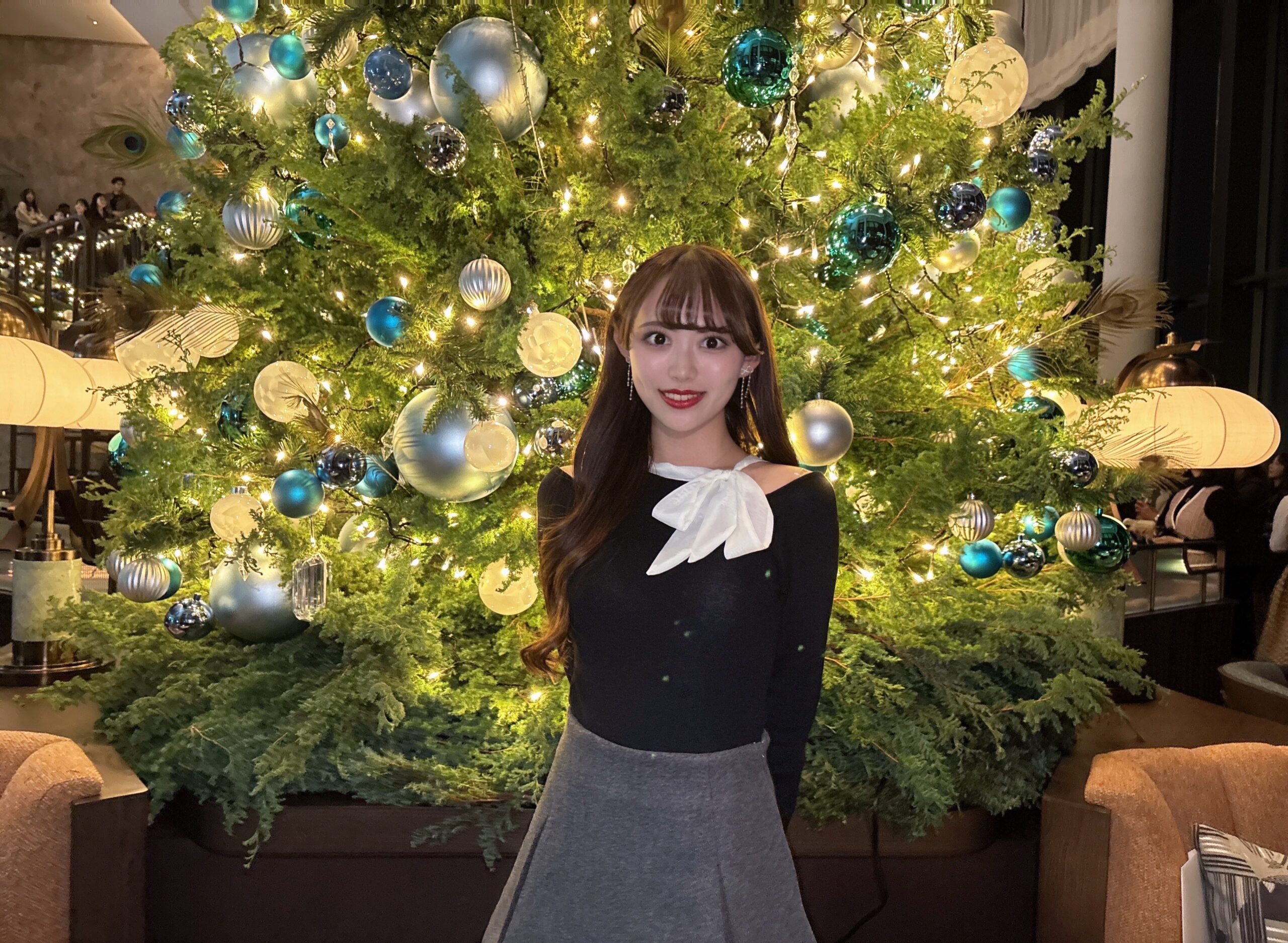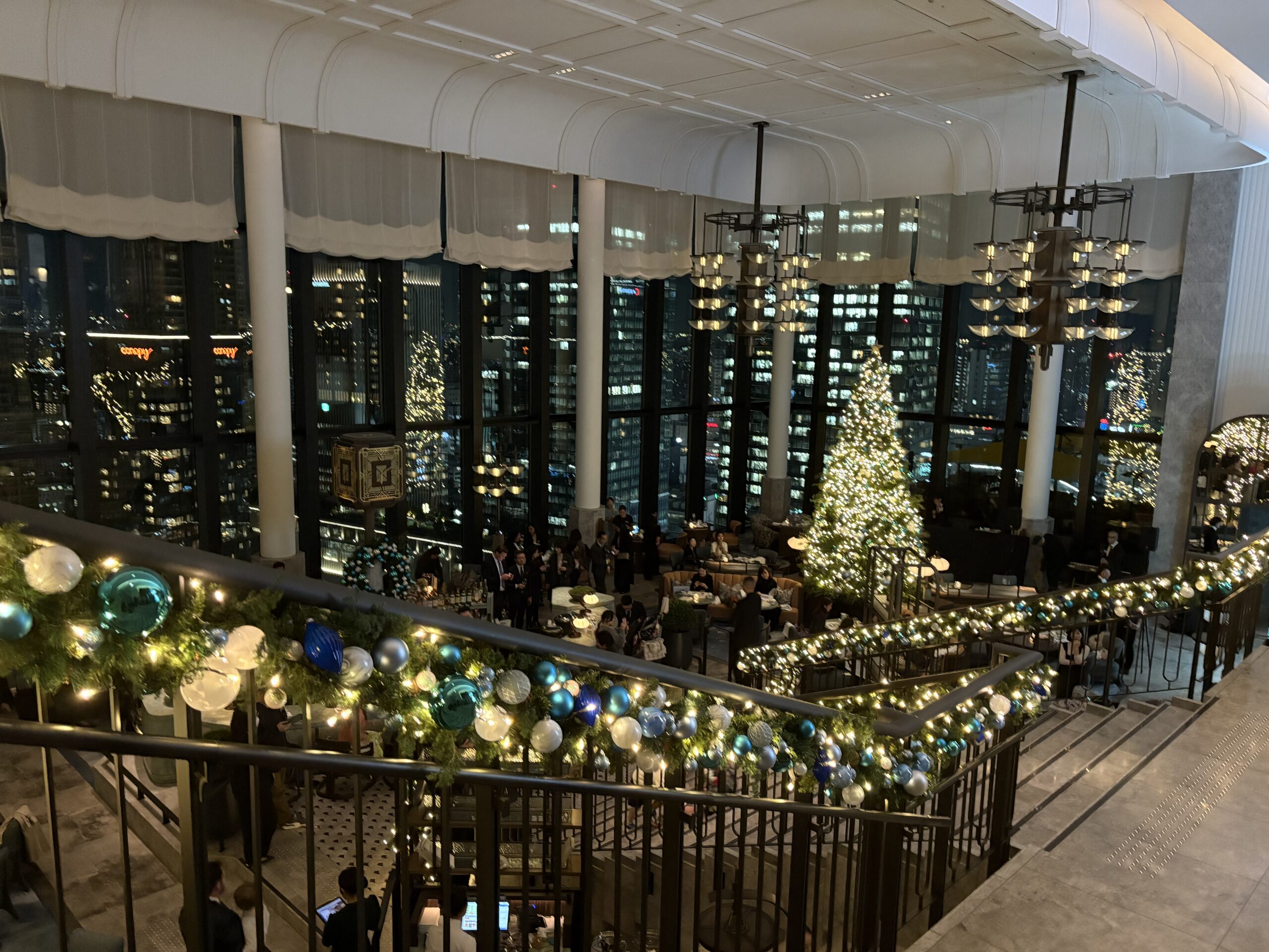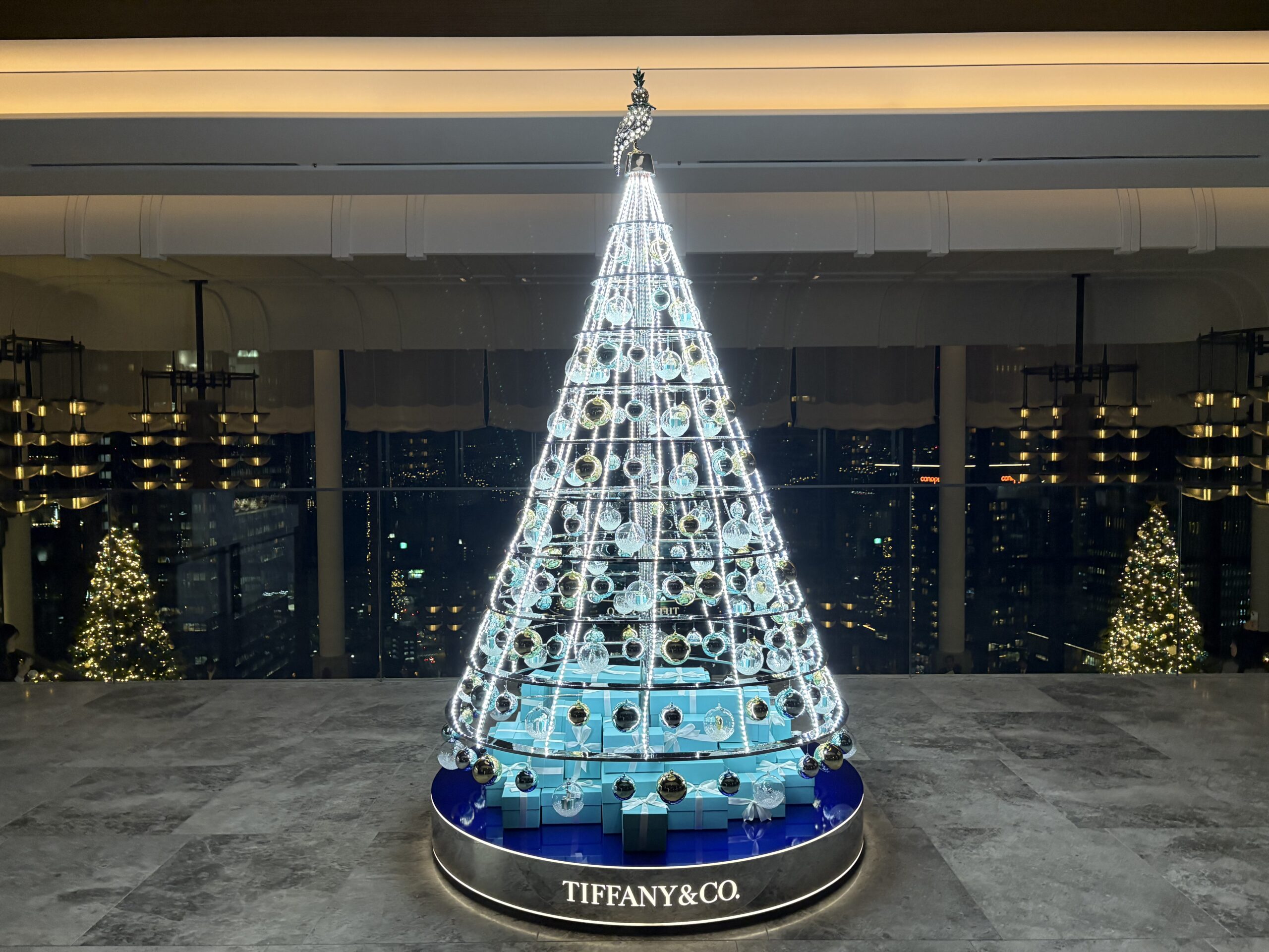 オーナメントや装飾には、ティファニーらしいアイコニックな“ティファニーブルー”がふんだんに使われていて、その色合いが館内の照明や夜景と絶妙に調和していました(*´▽`*)