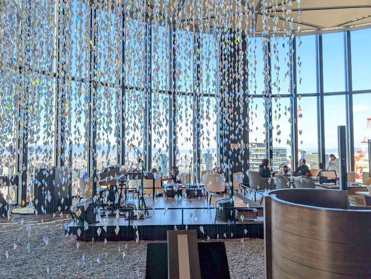 天井まで届くガラス窓からは、大阪の街並みが望め、まるで空に浮かんでいるようです。