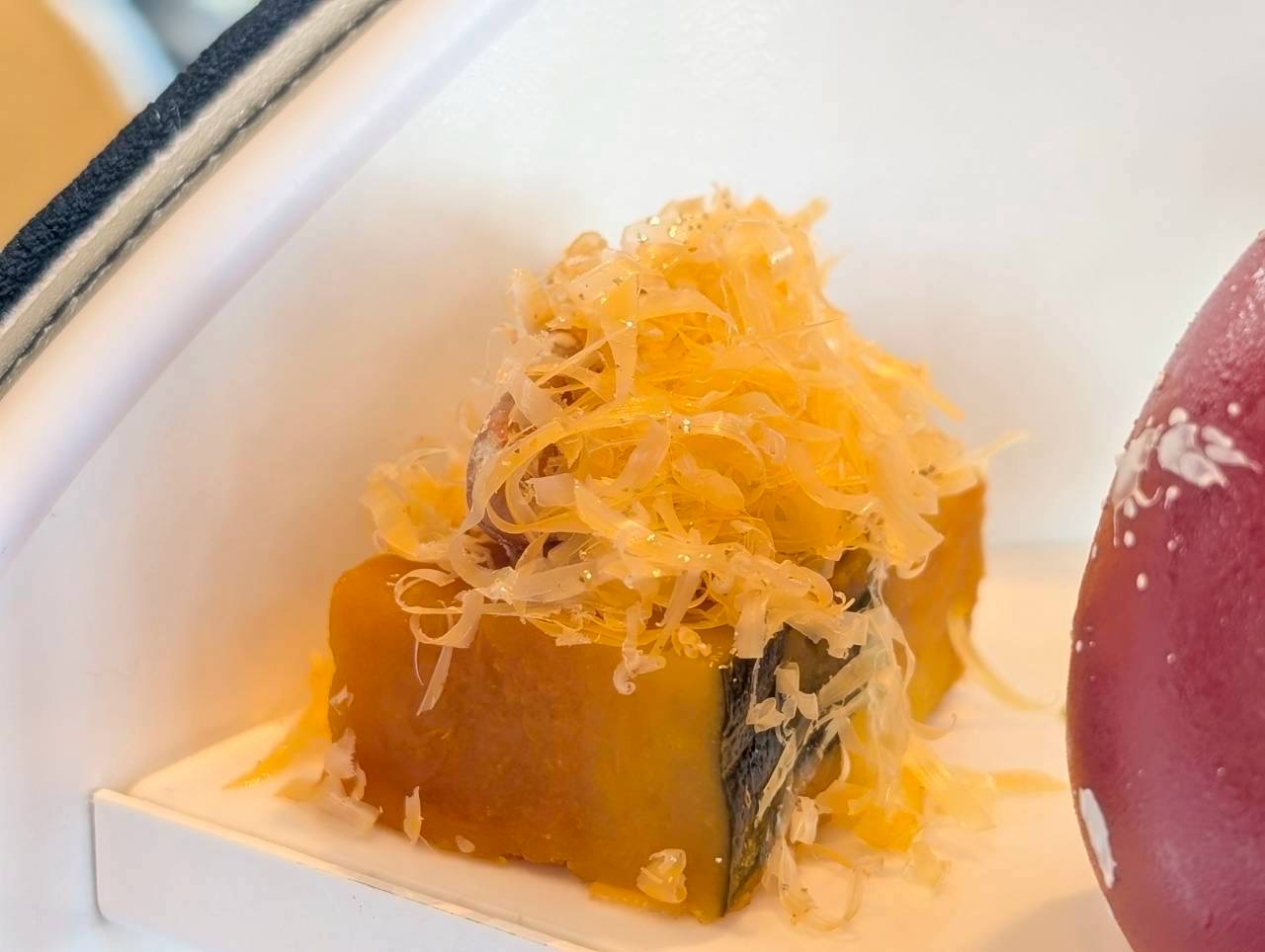 カボチャとサワークリームに、花びら仕立てのミモレットが華やかな「パンプキンプレッセ」。