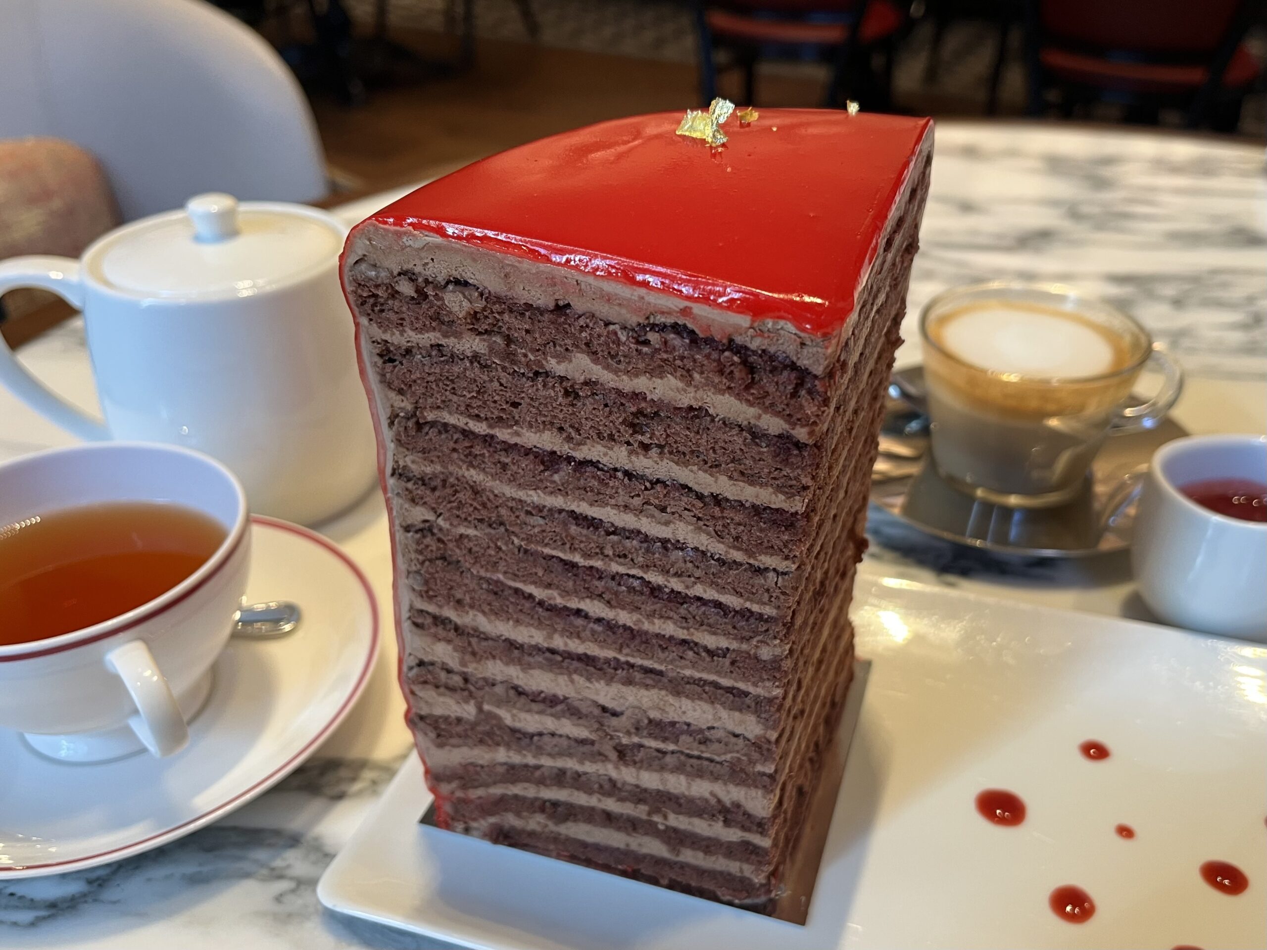 ブランドカラーでもある赤で贅沢に染められた、見た目にも驚く豪華なケーキです。