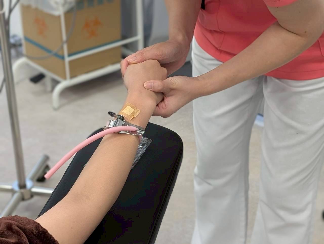 二の腕が静脈麻酔、太ももは硬膜外麻酔。
