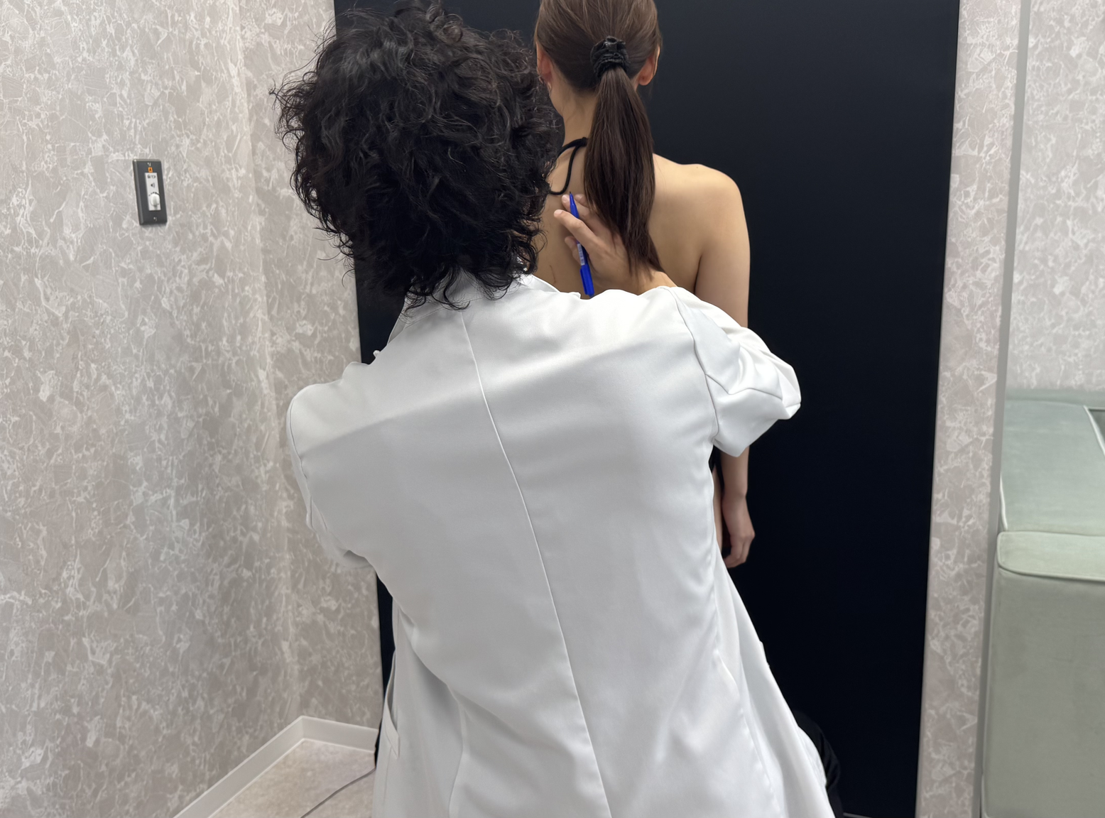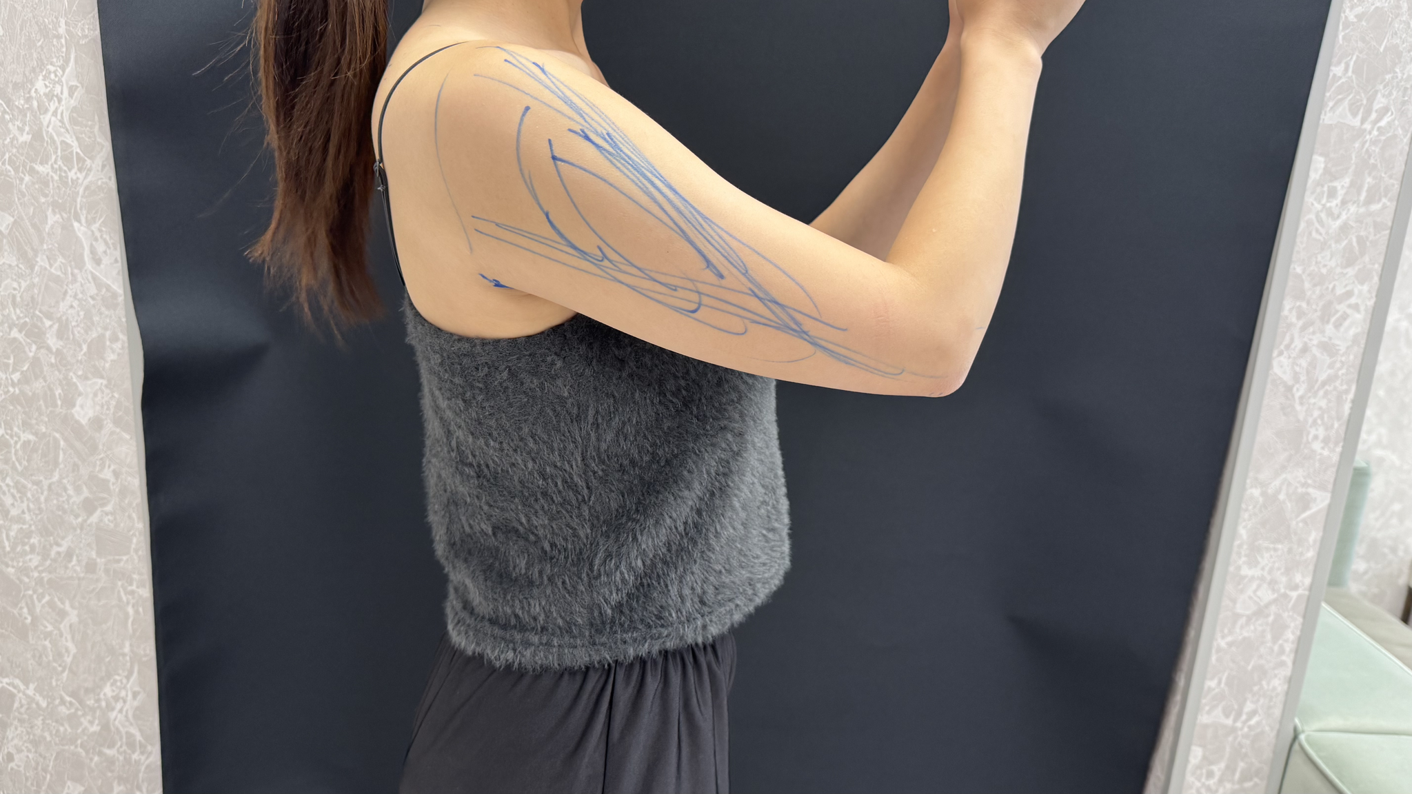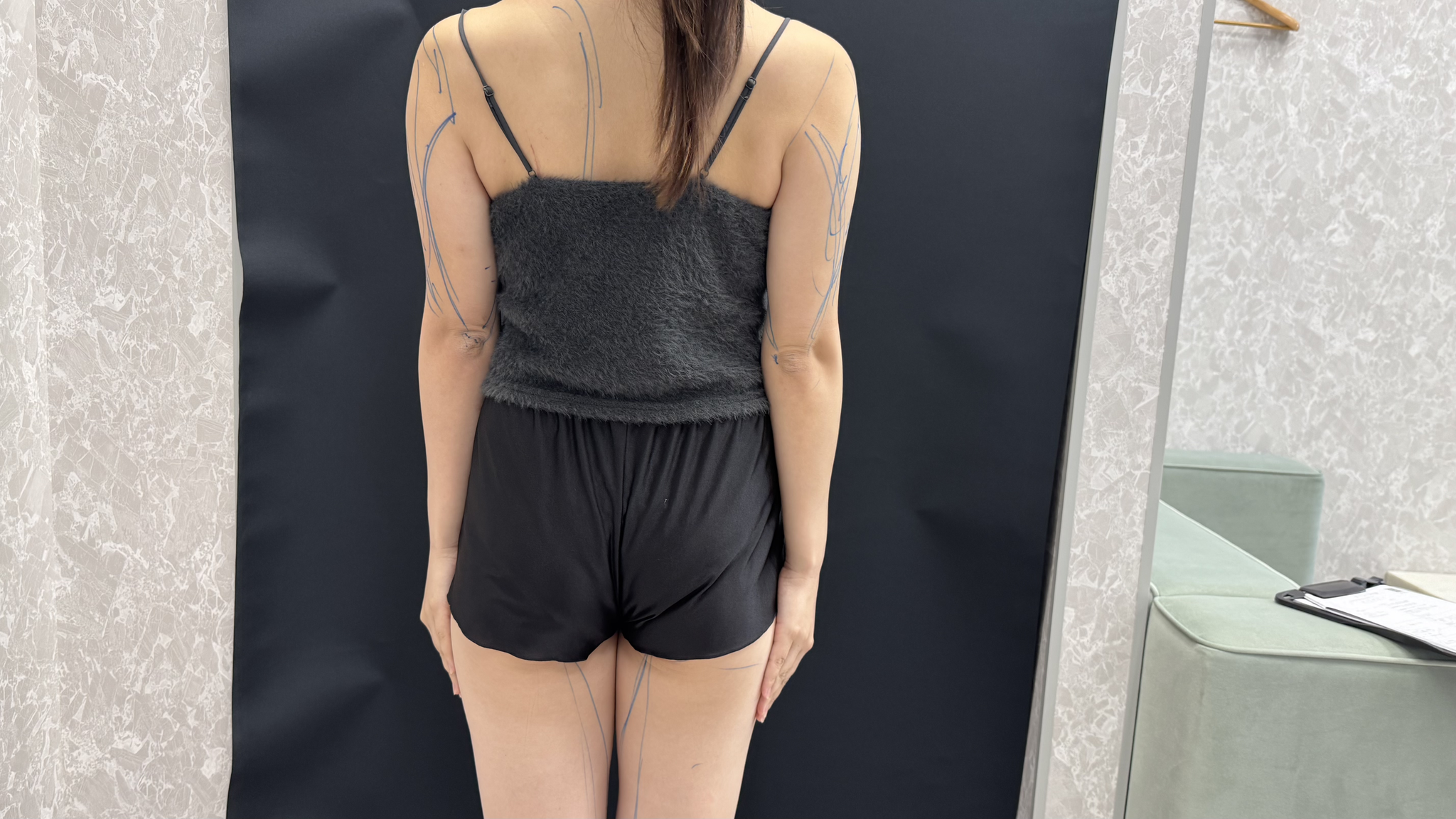 その後、改めて横谷院長によるマーキングも行われ、二の腕や内腿のライン、脂肪の取り方、仕上がりのイメージまで細かくデザインしてもらいました。