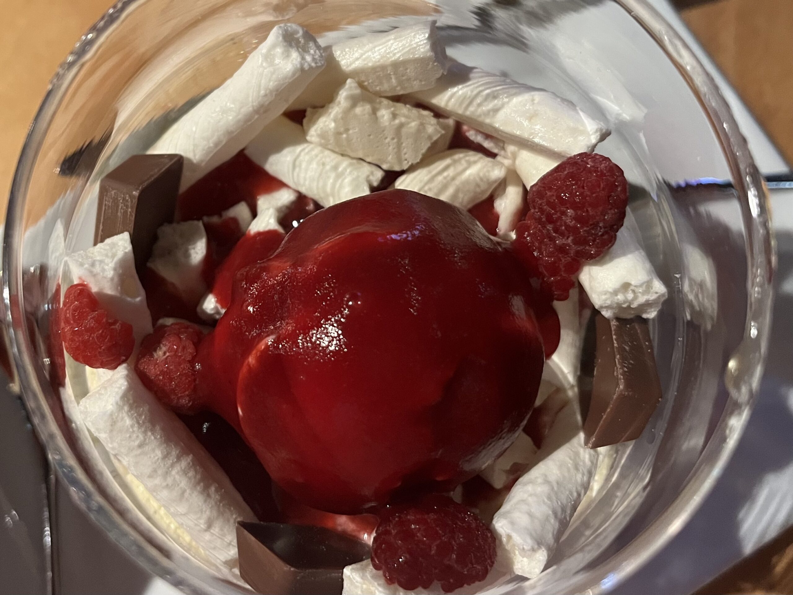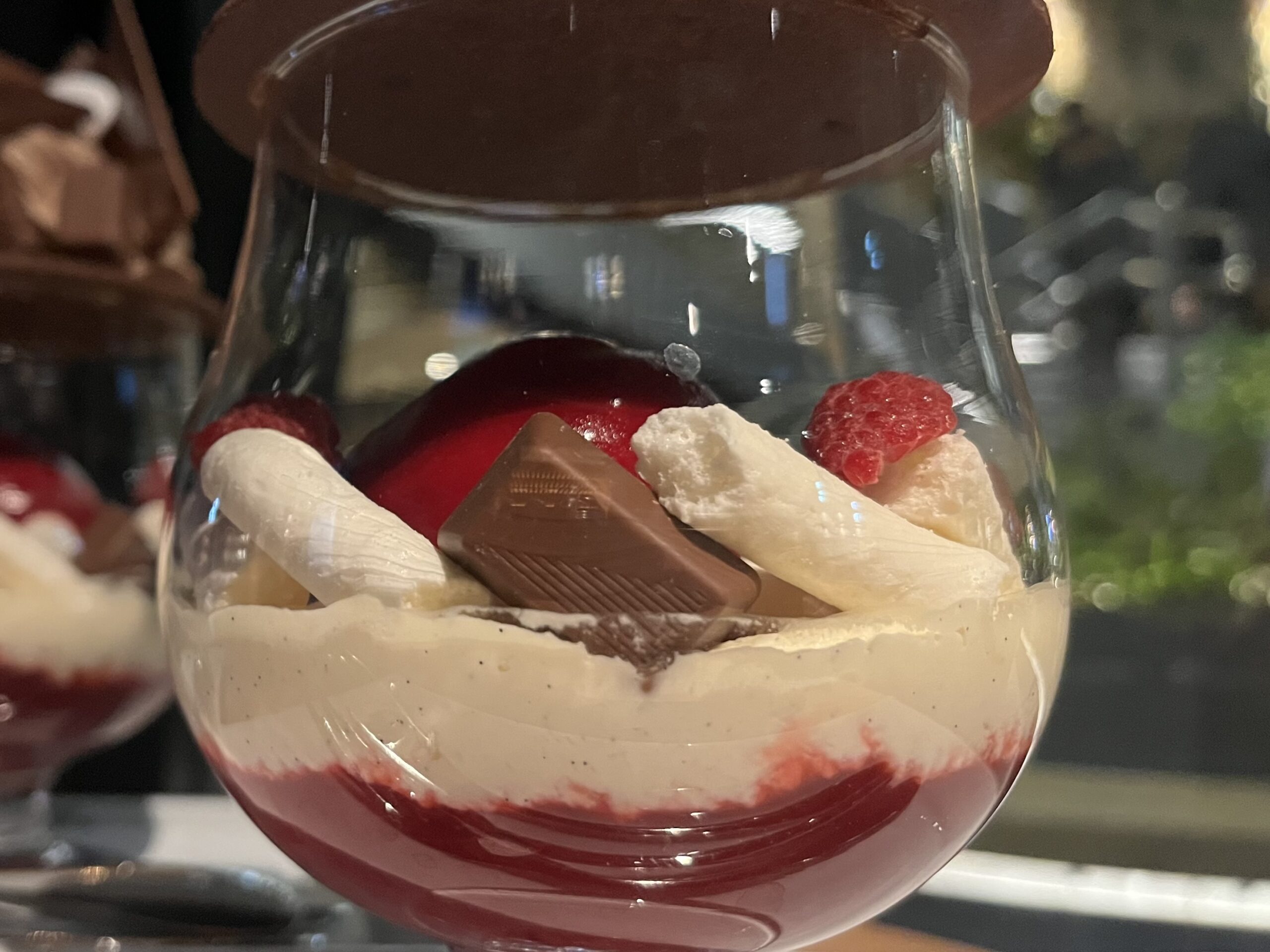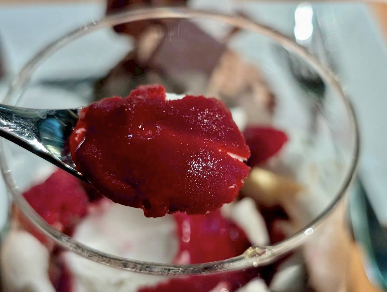 グラスの中には、甘酸っぱいフランボワーズのソースやジュレがたっぷり。