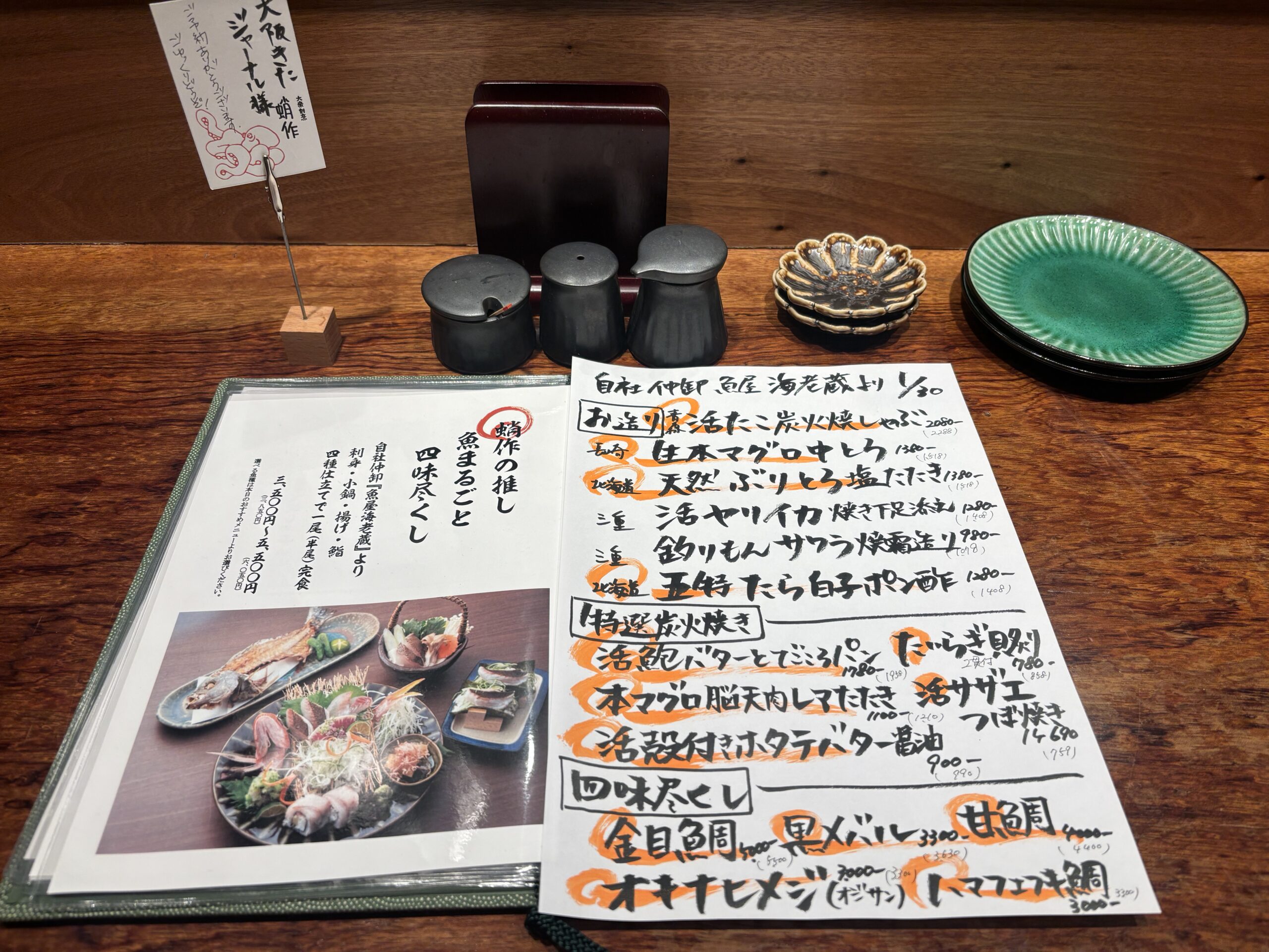 自社仲卸 魚屋海老蔵の強みを活かし、「刺身から炭火、〆の一皿まで、無駄なく正直な料理を提供していきたい」という思いが詰まった蛸作の本日のメニュー。