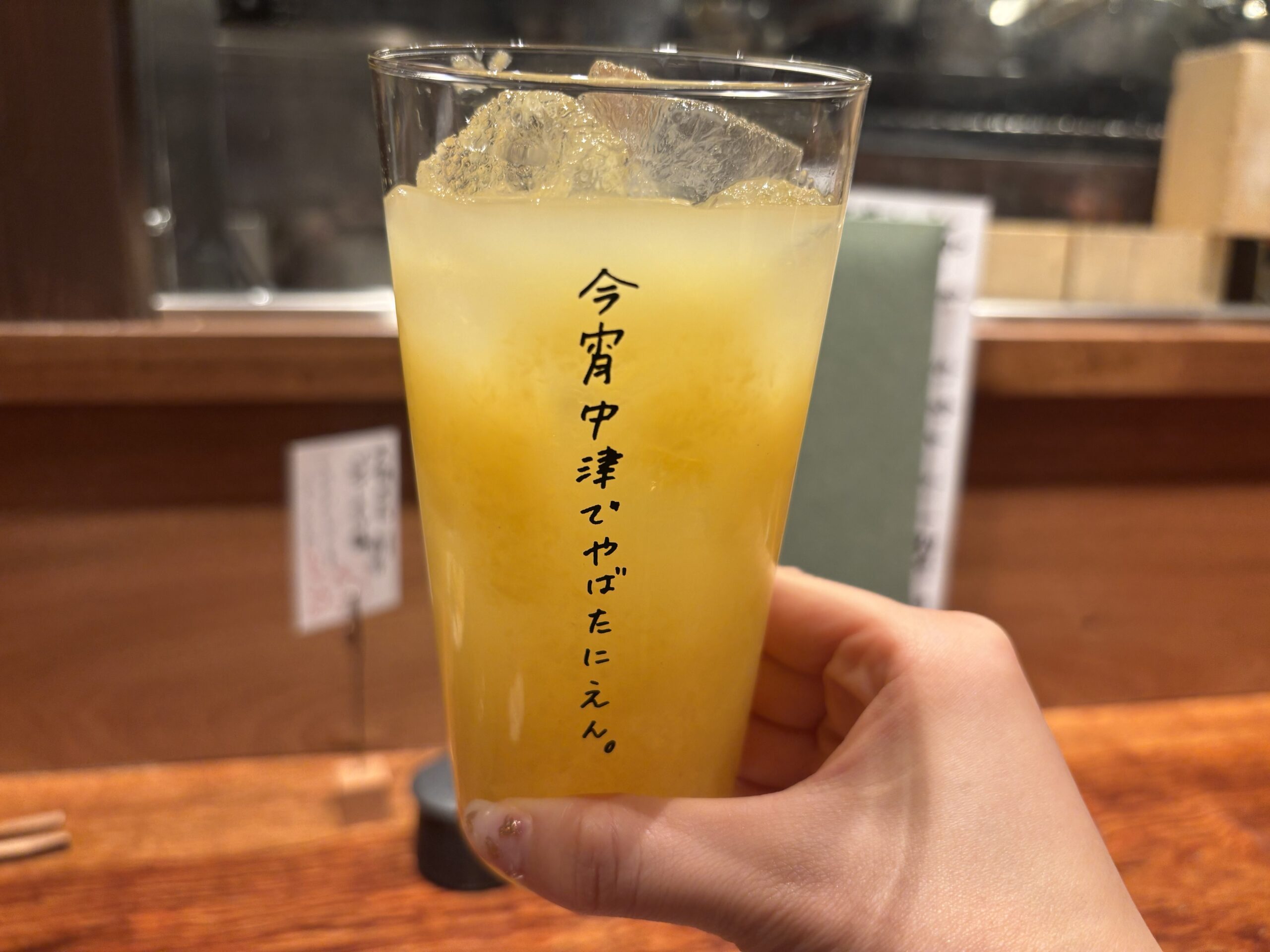 グラスのメッセージがとってもユニークで笑顔になります(^^♪