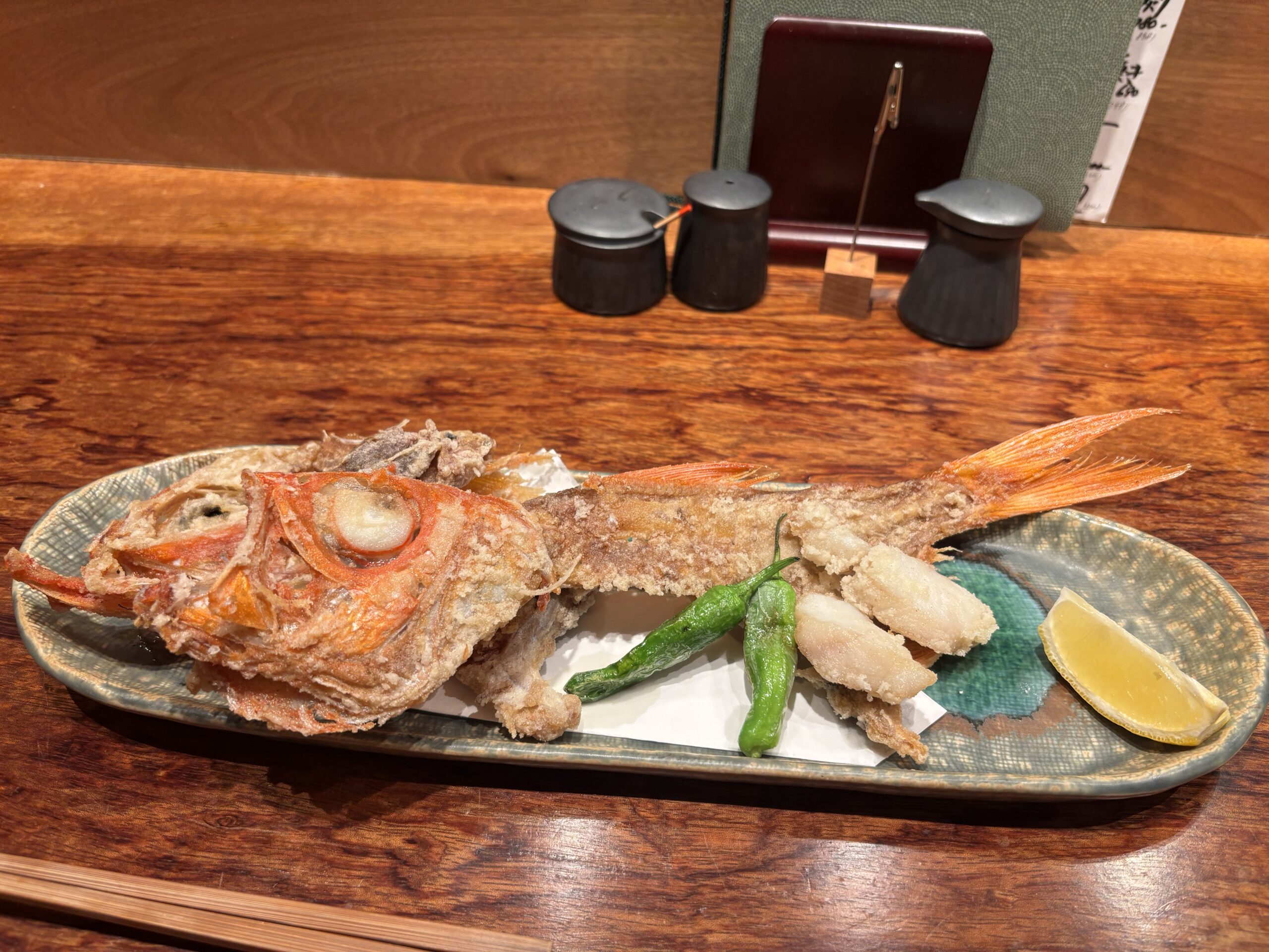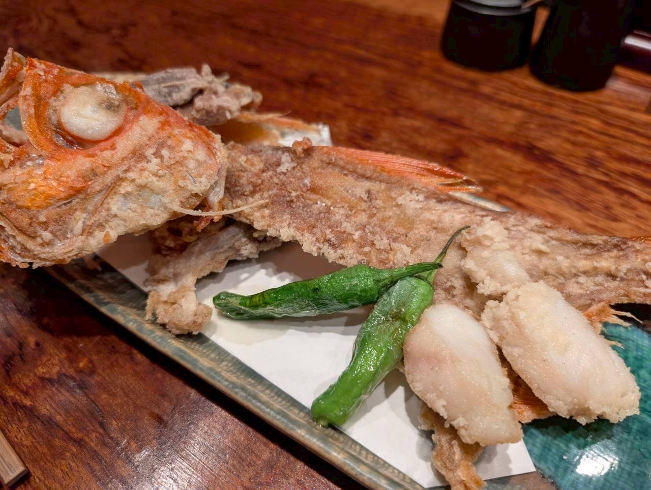 丁度良い塩味で、こんがりと揚げられていて顔や尾の部分までしっかりと金目鯛をいただけ、贅沢さ満点です。