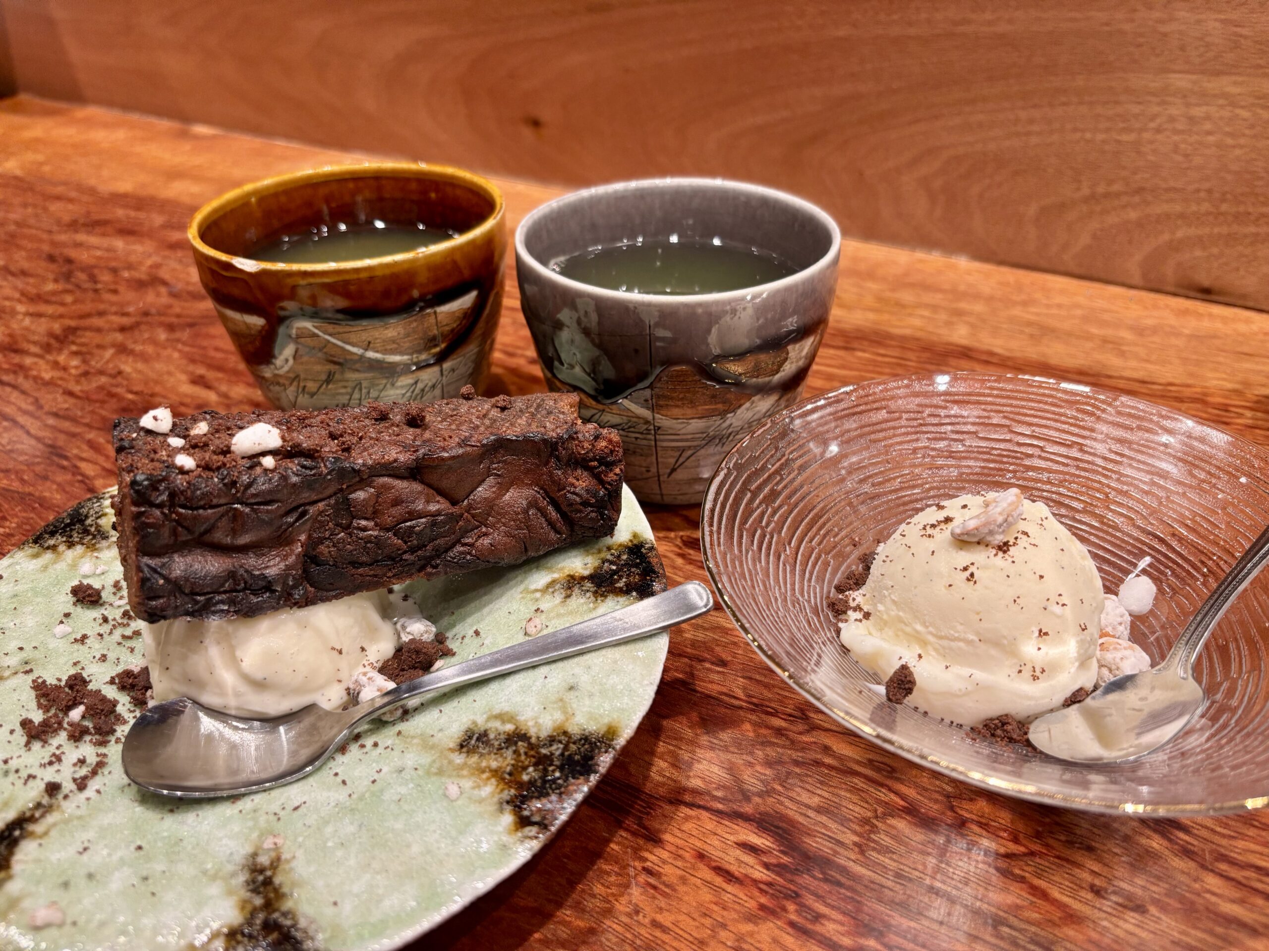「オーガニックミルクチョコの炭火炙り 858円」と「アレグロドルチェの極上バニラジェラート 528円」。