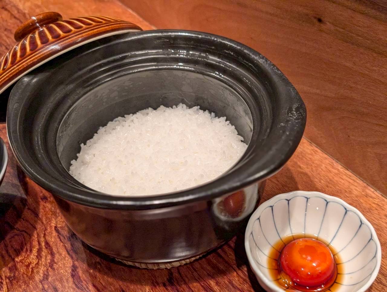 食事の締めくくりには、丁寧に炊き上げた土鍋飯「銀しゃり」+卵黄の醤油漬け。