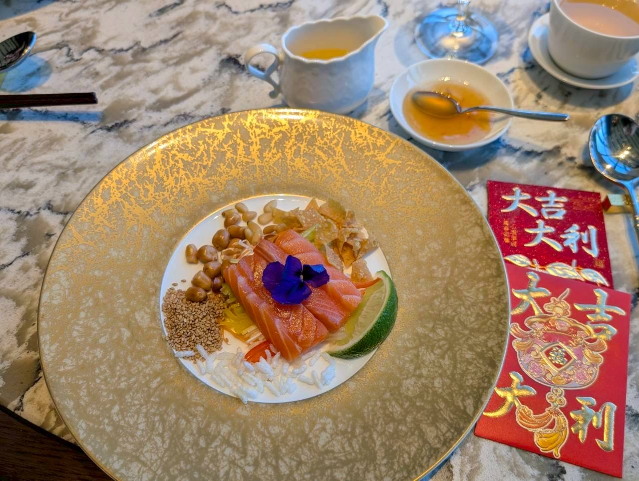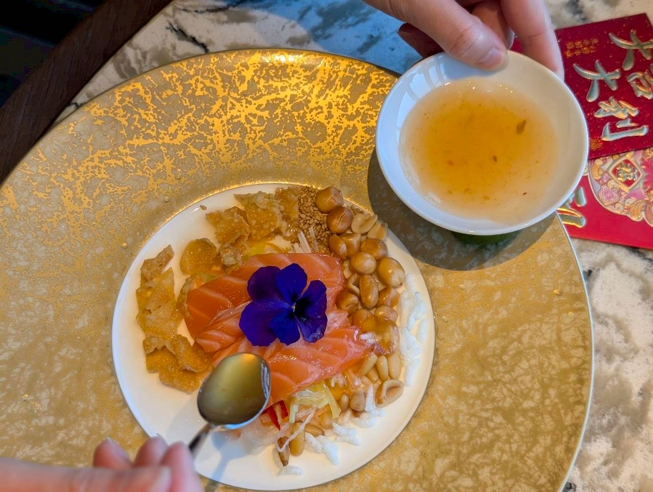 広東語で漁師が漁で綱を引く際の掛け声に由来する「ローへイ」は、刺身と色鮮やかな野菜を混ぜ合わせ商売繁盛を願う伝統の儀式料理です。