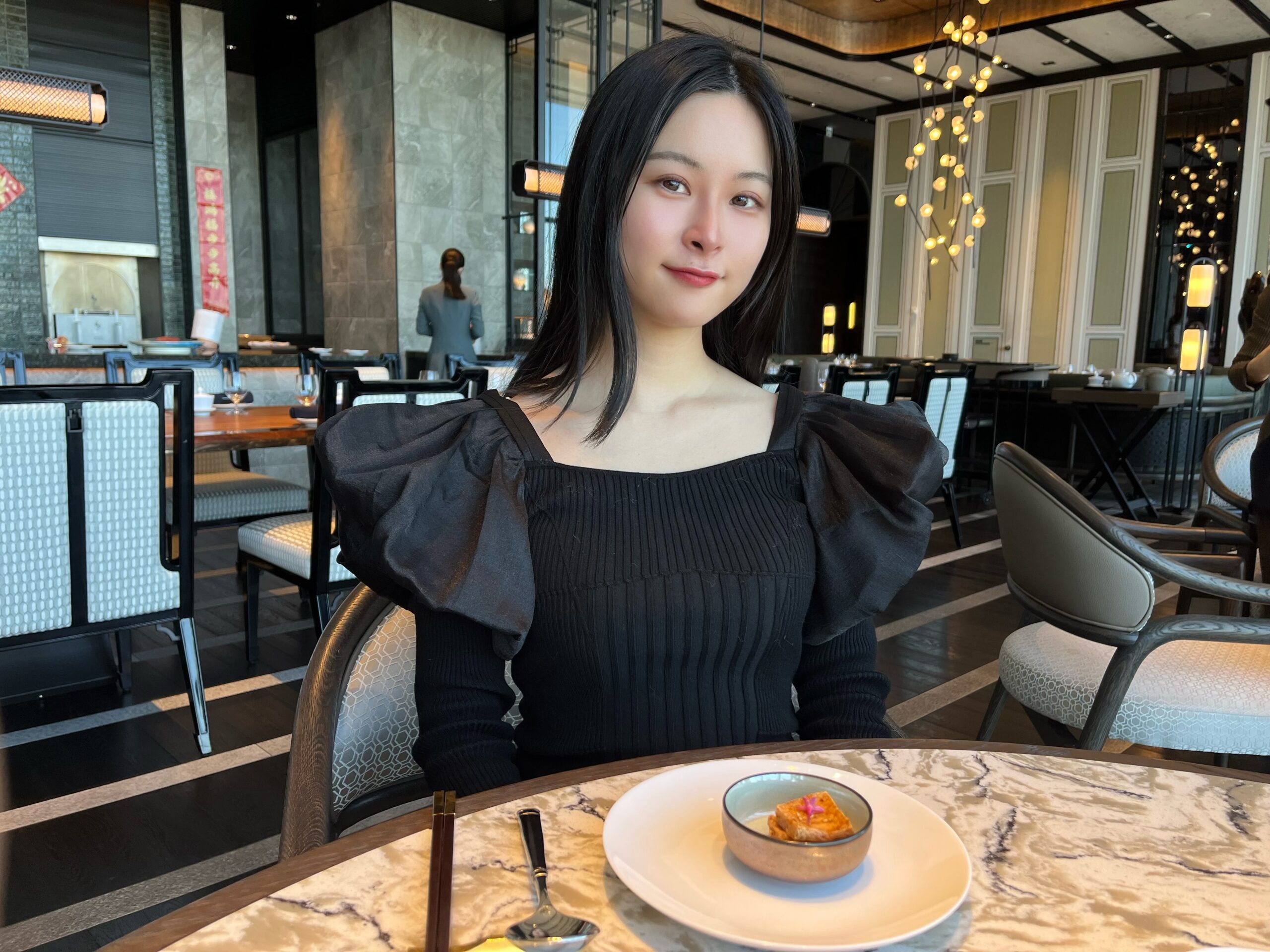 梅をモチーフにしたシャンデリアが象徴的な店内では、柔らかな光が落ち着いた空間を演出します。