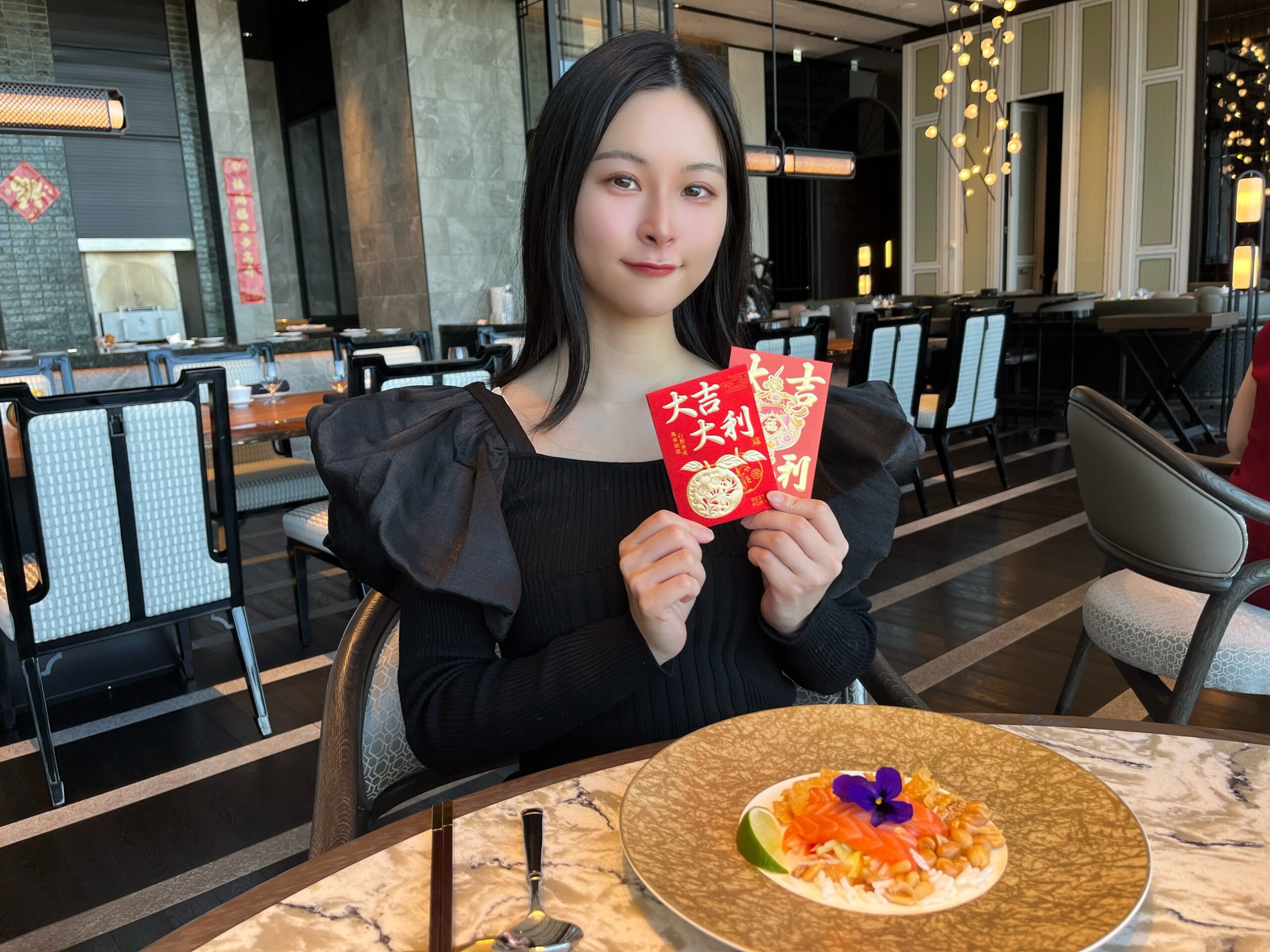 最後に、新年の幕開けを祝いながら高くお箸を持ち上げて混ぜ合わせ、笑顔と繁栄を祈る新年ならではの文化です。