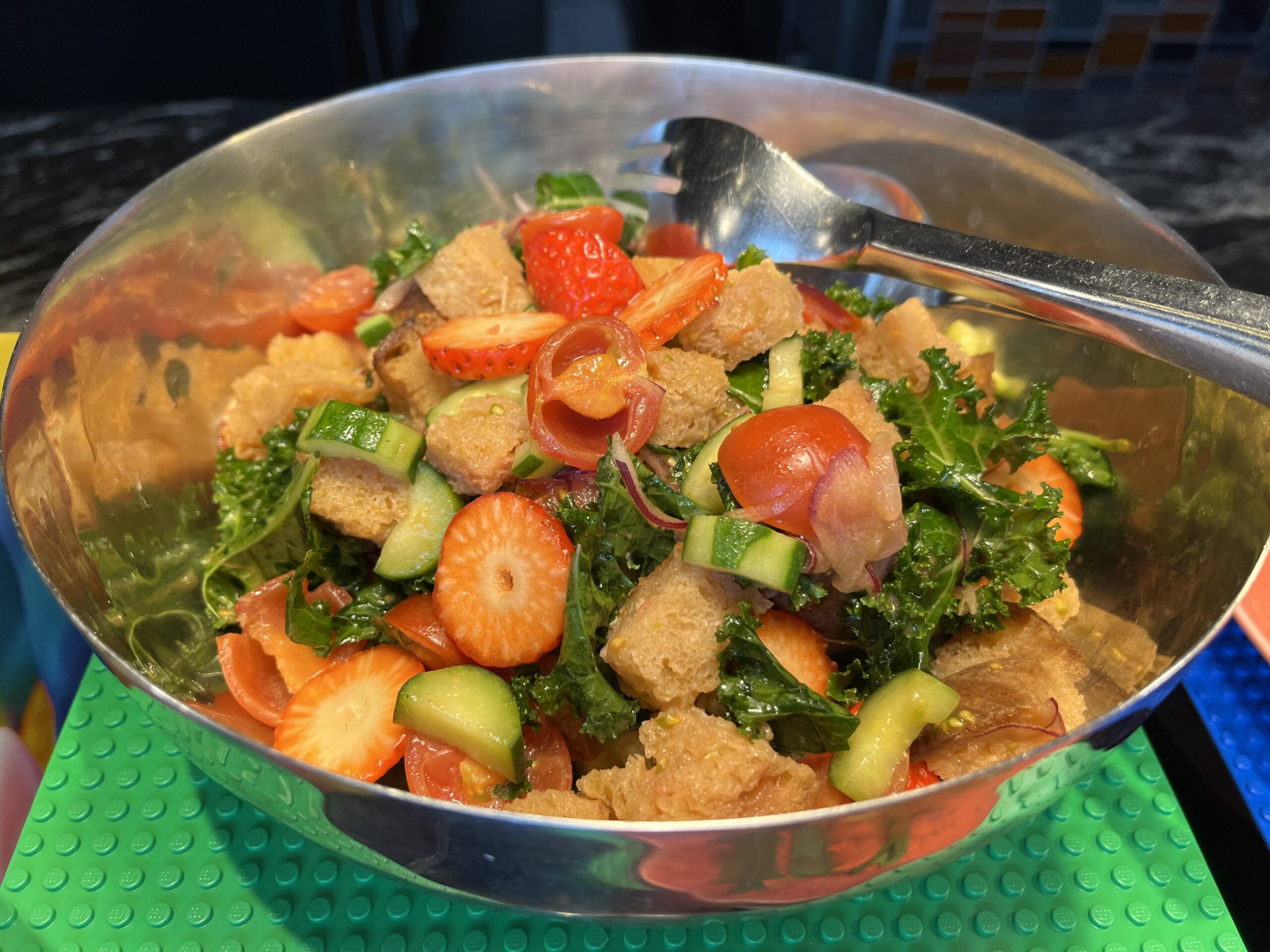 トマトとイチゴがとてもカラフルで、サラダでありながら、まるでデザートを食べているようです。