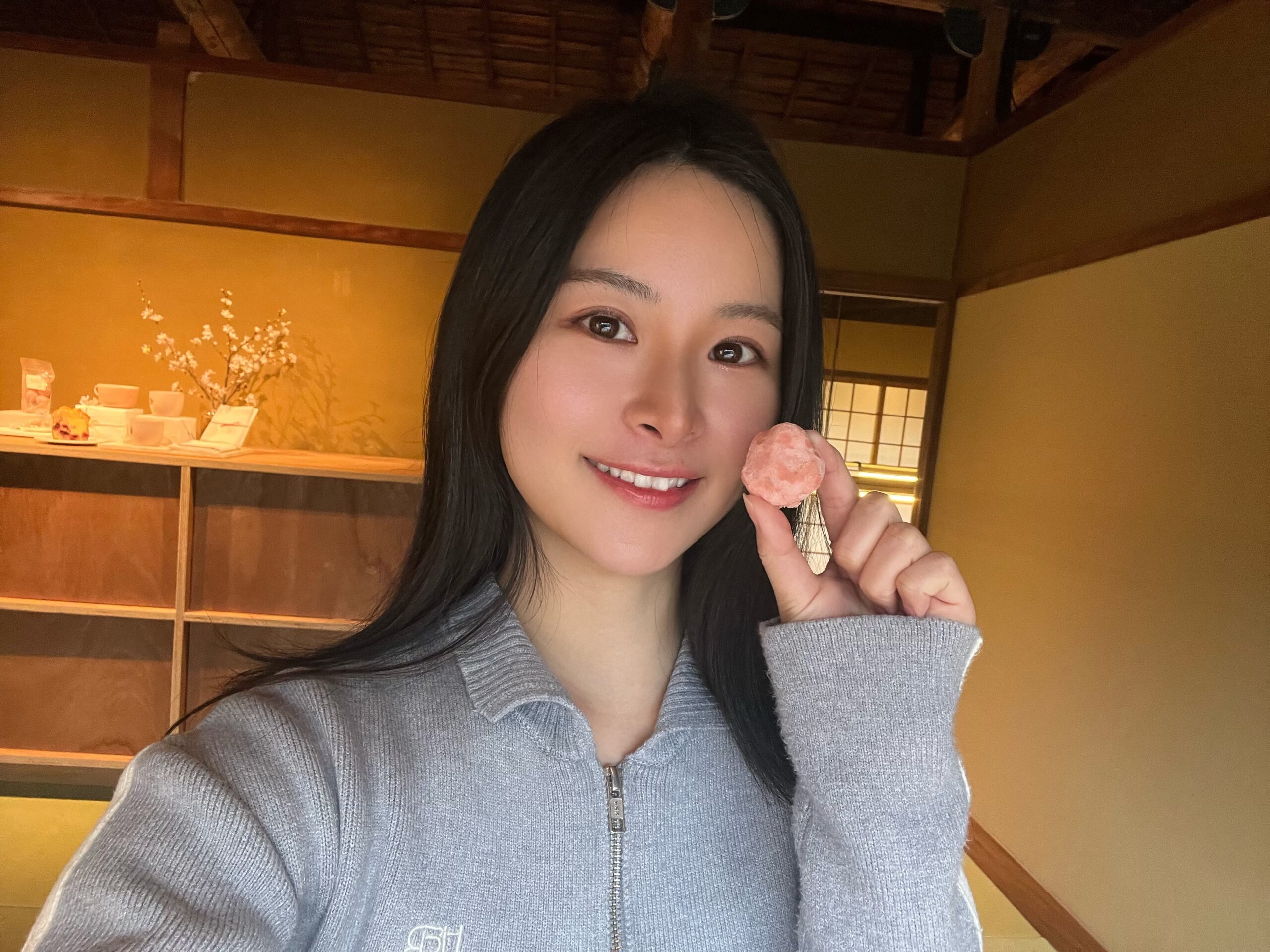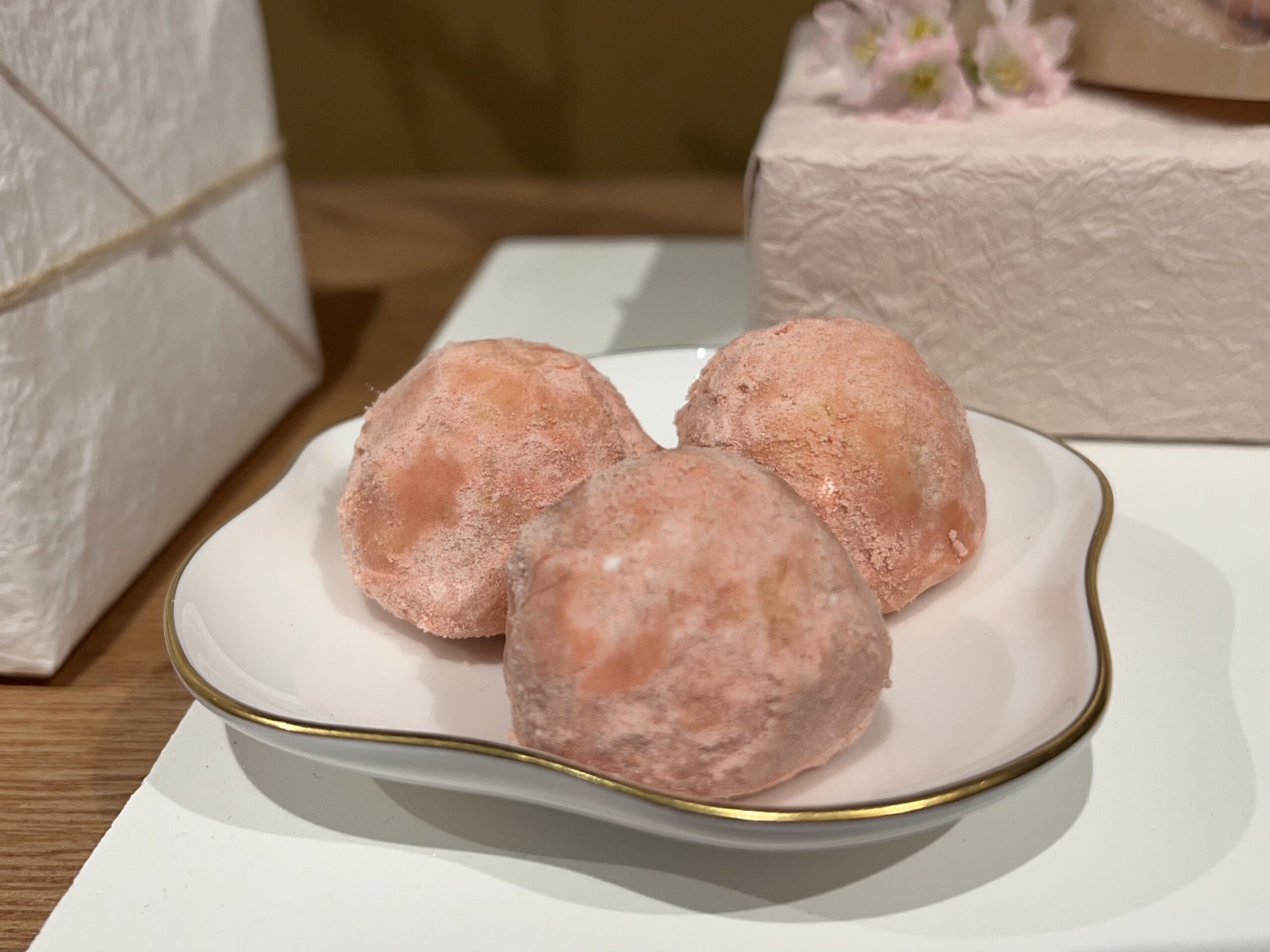 ころんとした一口サイズの丸いフォルムに、桜の花びらを思わせる淡いピンク色がふわりと重なり、見ているだけで笑顔になります。