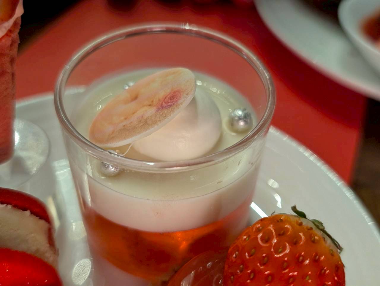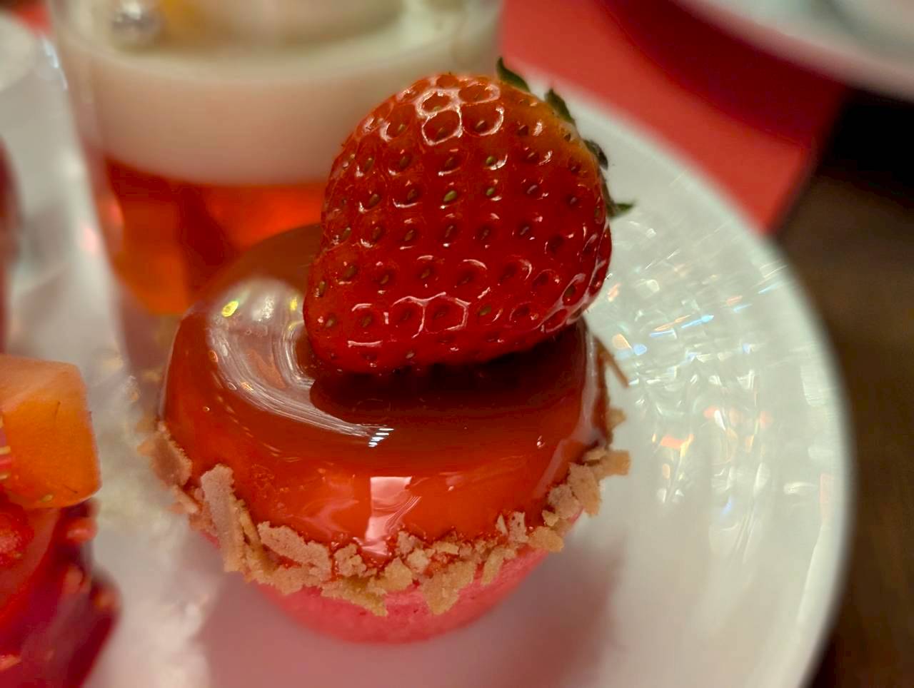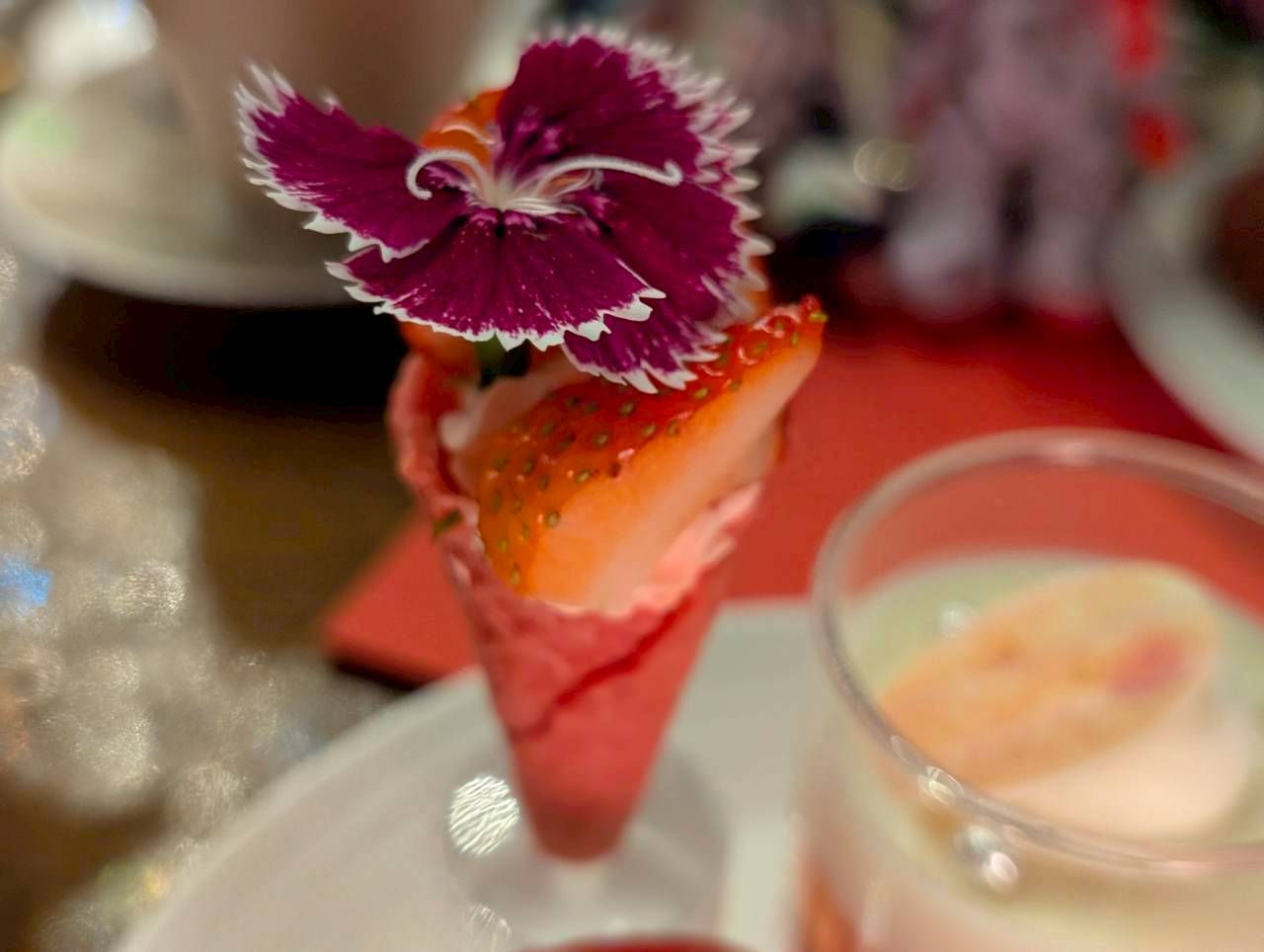 カモミールの優しい香りをまとわせたミルクパンナコッタとストロベリージュレを重ねたグラスデザートは、すっきりとした甘さの一品です。