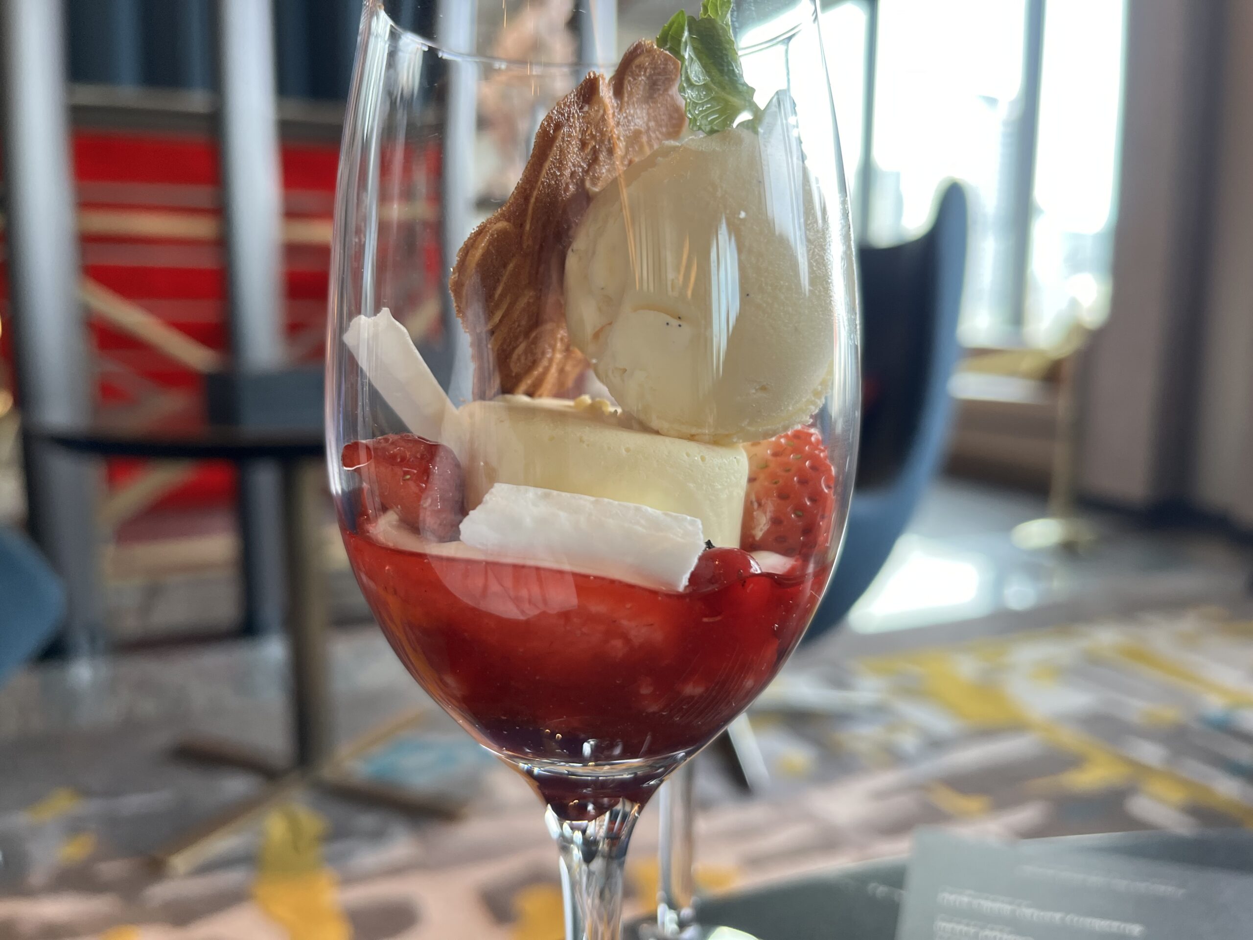 赤ワインがほのかに香り、ひと口目から大人の余韻が広がる「イチゴのメルバ風パフェ」です。