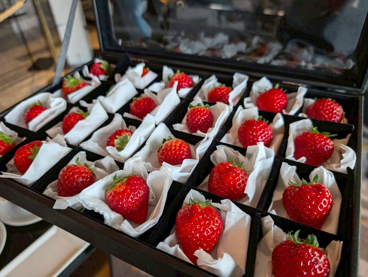 真っ黒の箱をそっと開けると、まるで宝石箱のようにいちごがキラキラと輝き出します。