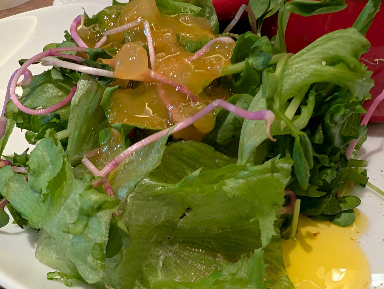 みずみずしい野菜のサラダに季節のドレッシングでいただきます。