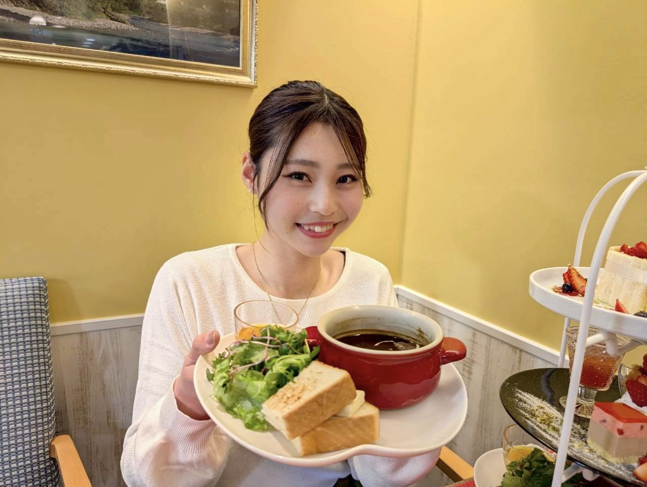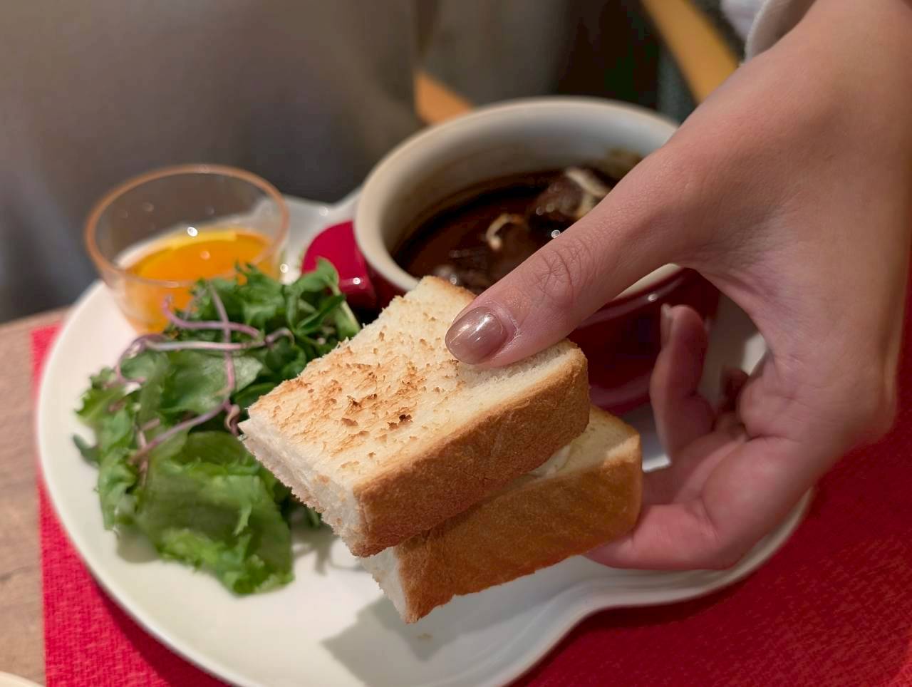 りんごの形をしたプレートには、国産牛のビーフシチュー・自家製山型パン・サラダがセットになっており、甘いスイーツの合間にちょうど良いバランス。