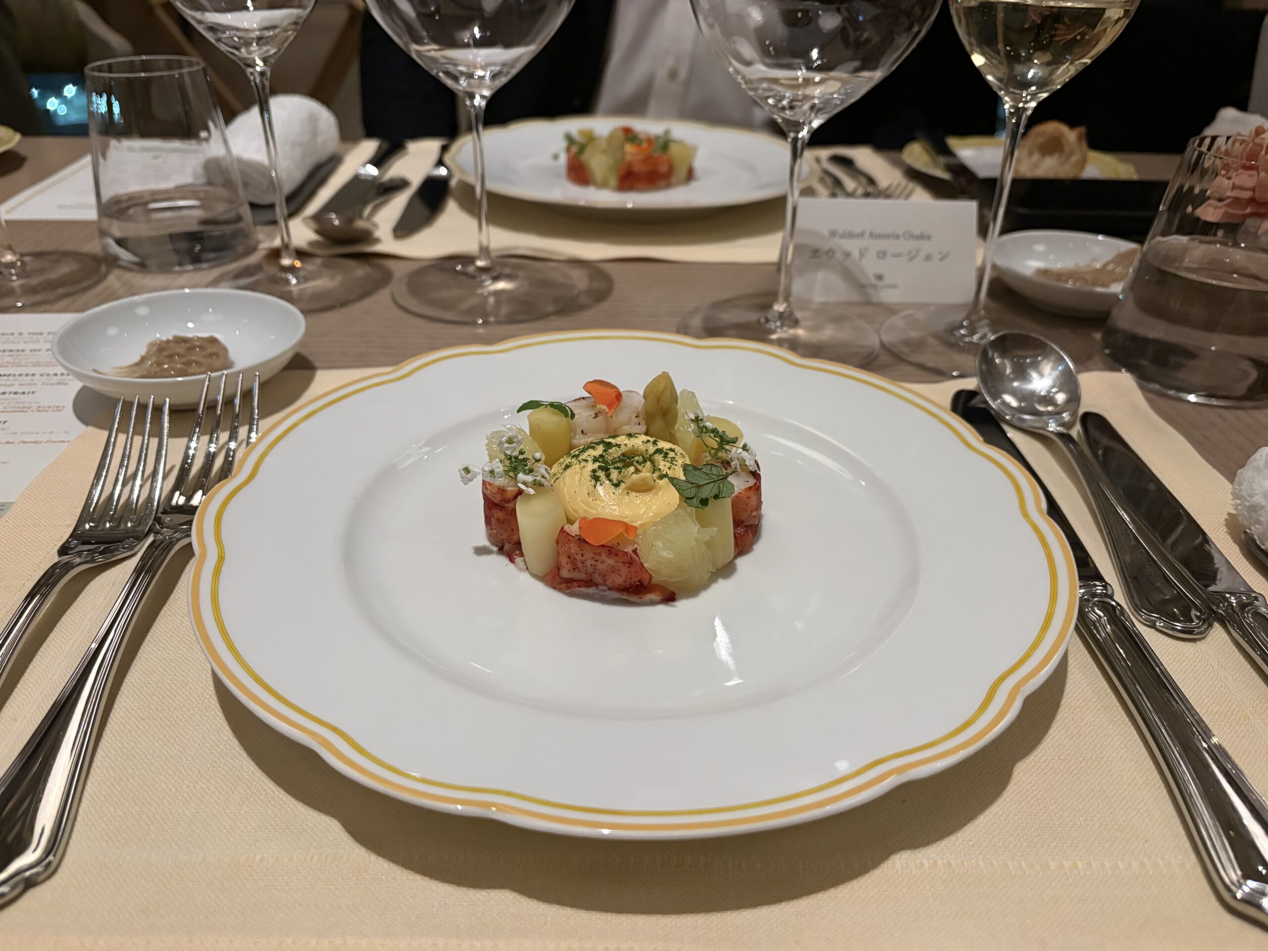 オマール海老のポシェは、ホワイトアスパラガスと柑橘のソースが春らしい一皿。