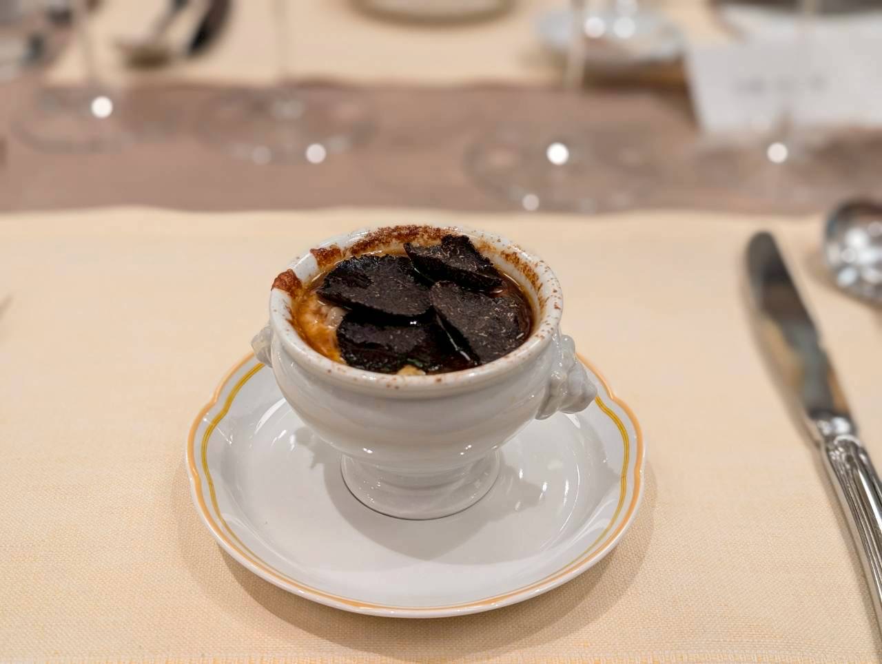 トリュフ香るオニオングラタンスープは、心まで温まる深い味わいに。
