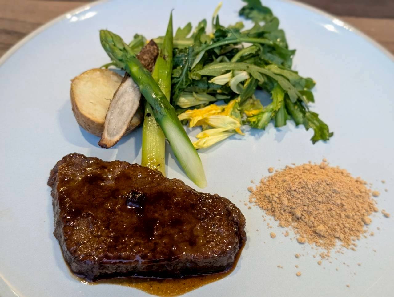 大阪産 なにわ黒牛のブレゼ、奈良漬けのアクセント 奈良県産と大阪産野菜のフリット、大鉄砲きなこのコンディメント 春の香味サラダ、大和橘ドレッシング