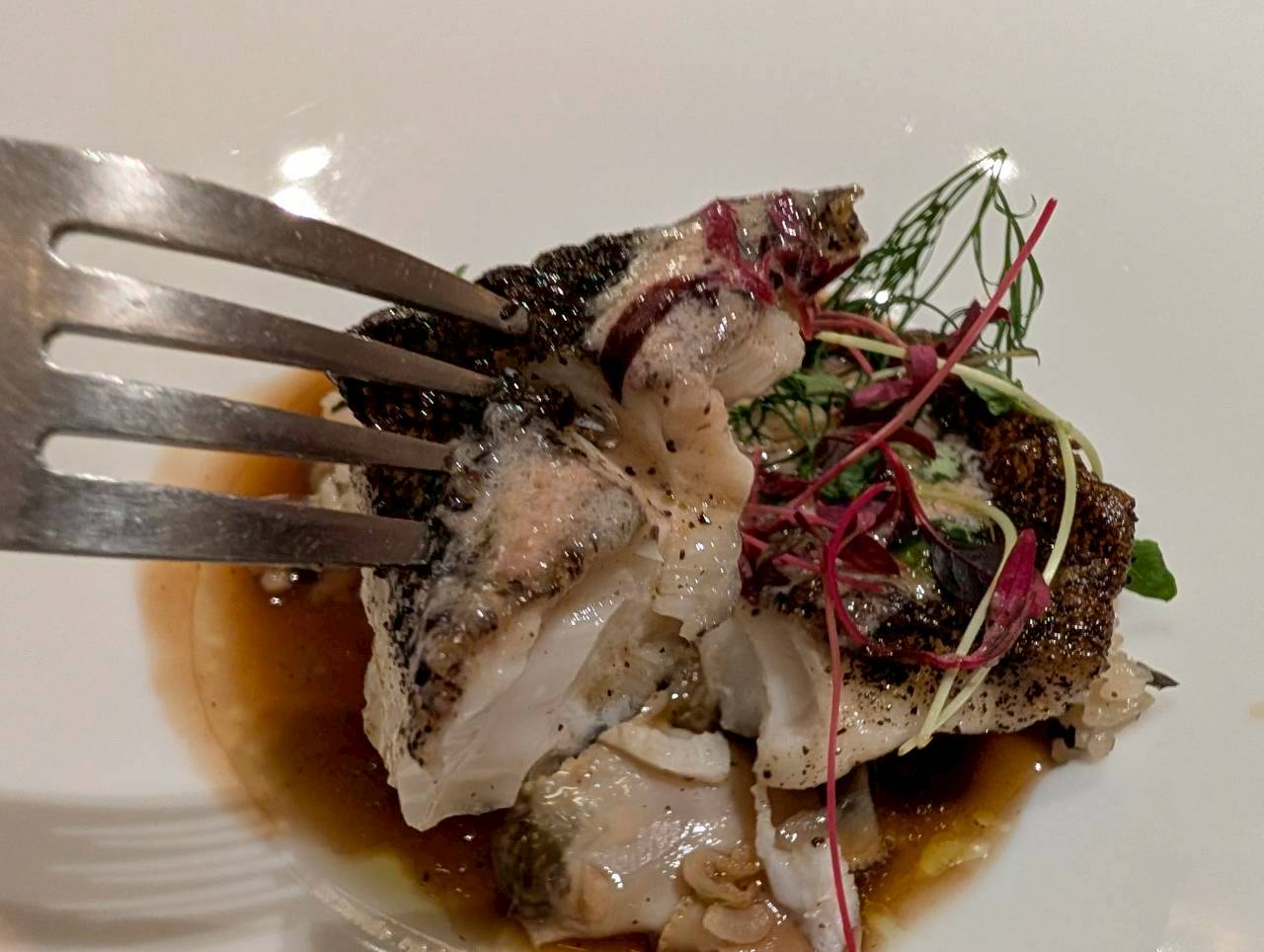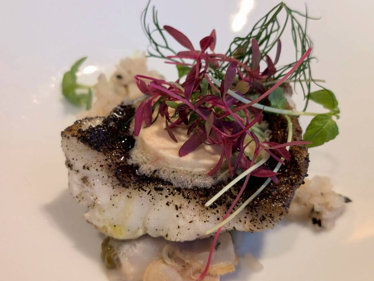 メバルのポワレ -桜花塩漬けバター「嘉兵衛本舗の天日干し番茶」で蒸し上げた春の貝、奈良県産 ヒノヒカリの茶粥番茶の葛湯を掛けて