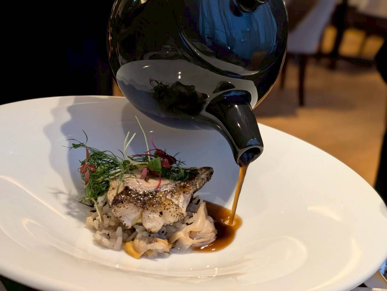 魚料理は、茶粥のイメージを重ね、メバルのポワレを茶飯や蒸した貝とともに盛り、仕上げに茶番を注いで味わうスタイルです。
