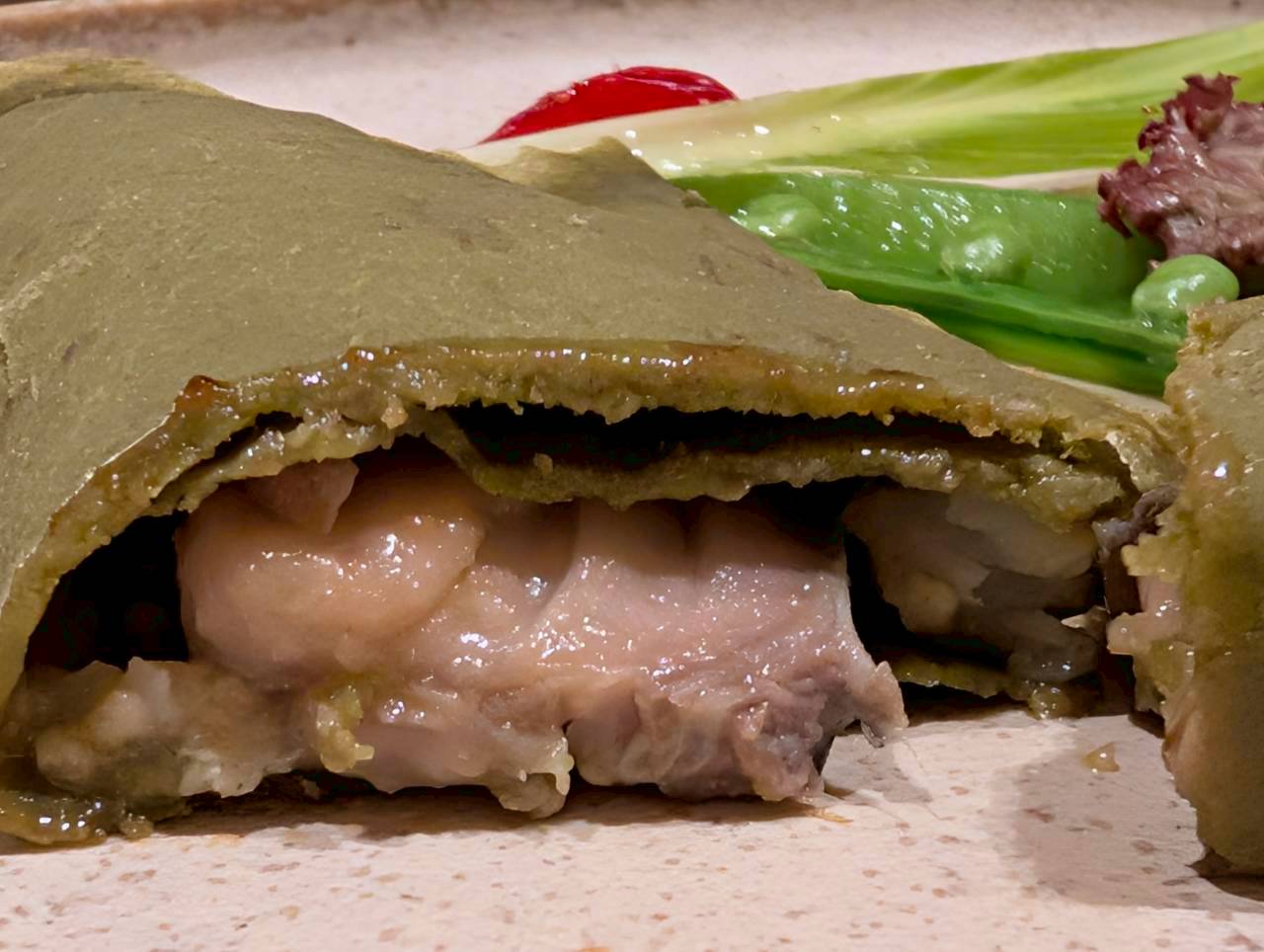 炙り鰆のマリネを、柿の葉茶と吉野本葛で作るガレットで包み、柿の葉寿司を連想させる仕立てに。