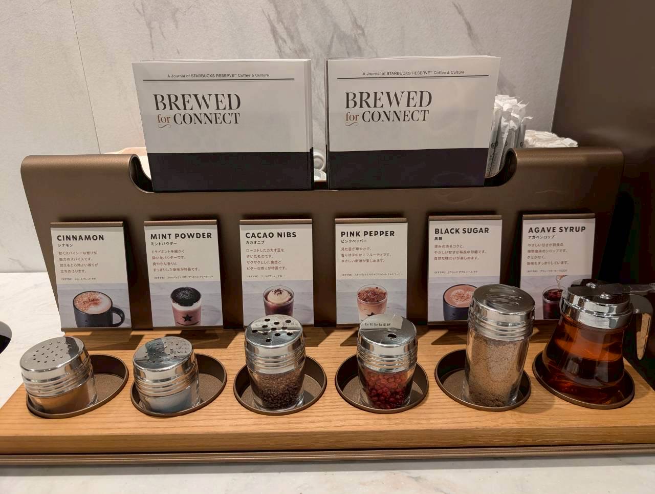 なんと、カカオニブ、黒糖、ピンクペッパー、ミントパウダー、シナモン、アガベシロップの6種類のコンディメントを自由に試せる「ディスカバリーカウンター」が設置されています。